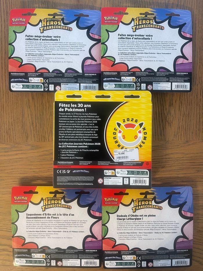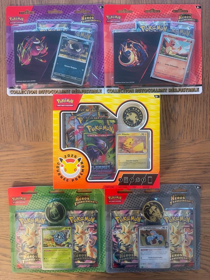 Lot Pokémon comprenant: - un coffret spécial 30 ans Pokémon - 2 Duopacks Héros Transcendants à l’effigie de Saquedeneu d’Erika et Dodoala d’Okuba - 2 Tripacks Héros Transcendants à l’effigie de Salameche et Fantominus Possibilité de remise en mains propres en Normandie ou envoi rapide et soigné sous papier bulle. Réductions également en cas d’achats groupés avec d’autres produits de mon dressing , allez faire un tour sur mon dressing!😏