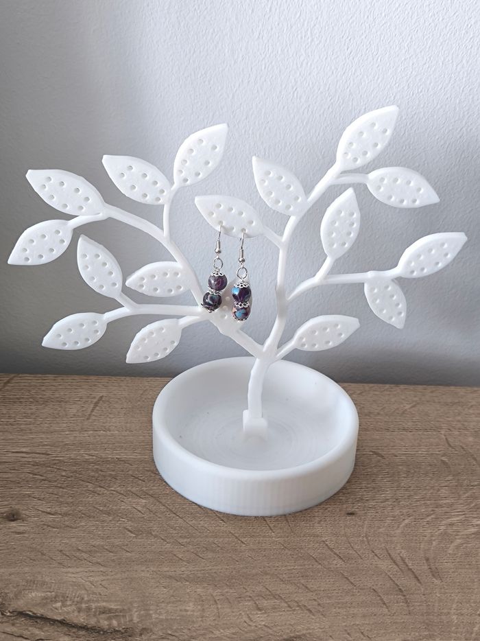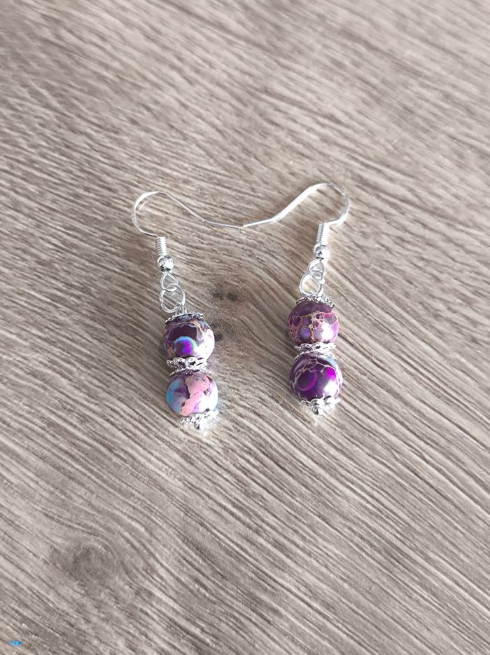 Les boucles d'oreilles sont pendantes avec perles violettes, bleu, rose, sable