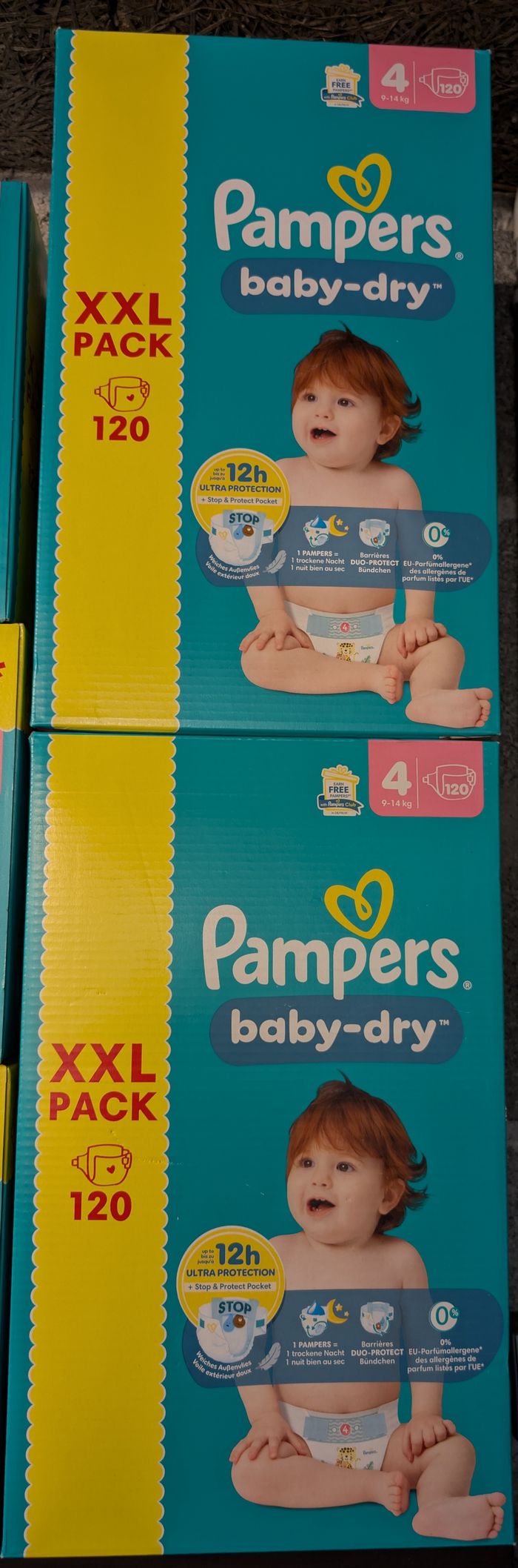 2 paquets de 120 couches Pampers taille 4 (9-14 kg). Neufs, jamais ouverts.