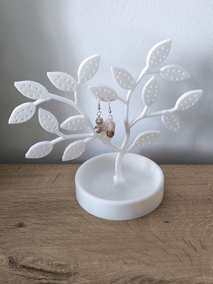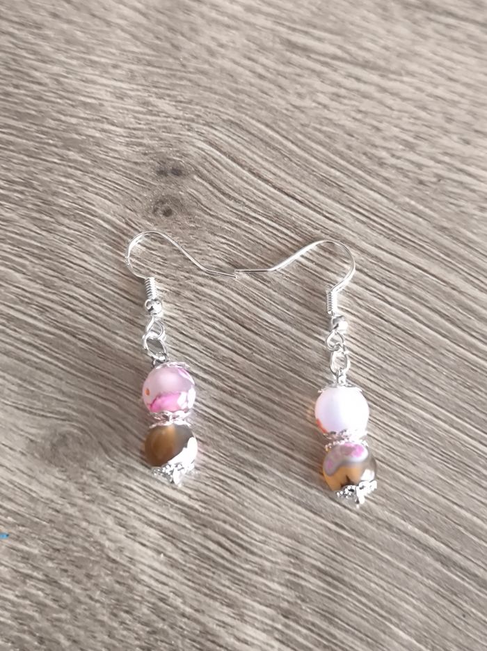 Les boucles d'oreilles sont pendantes avec perles roses, marrons