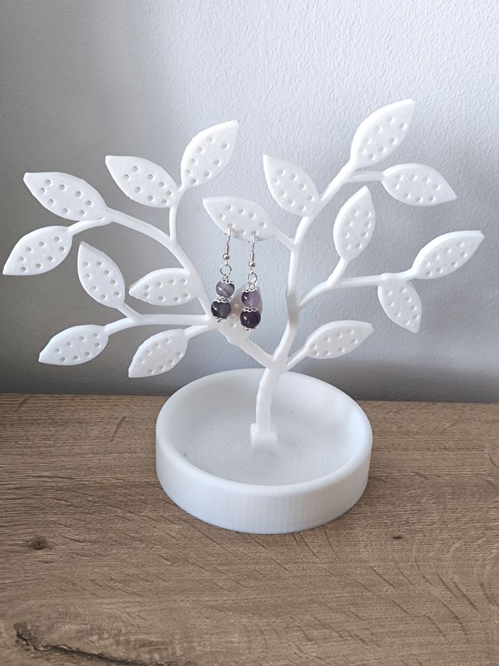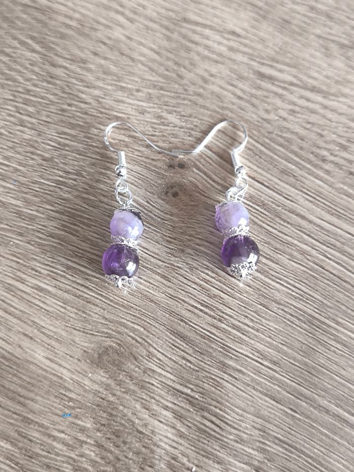 Les boucles d'oreilles sont pendantes avec perles violet améthyste