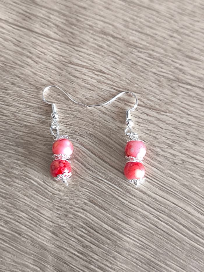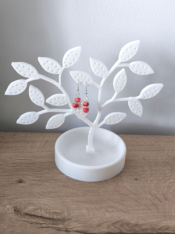 Les boucles d'oreilles sont pendantes avec perles rouges tachetées