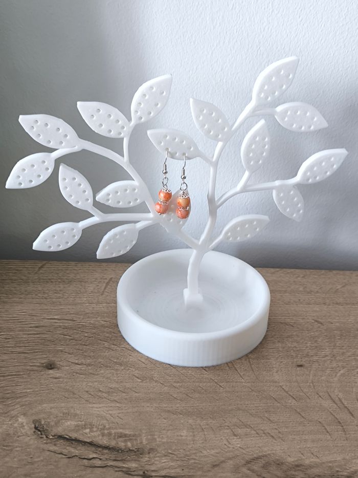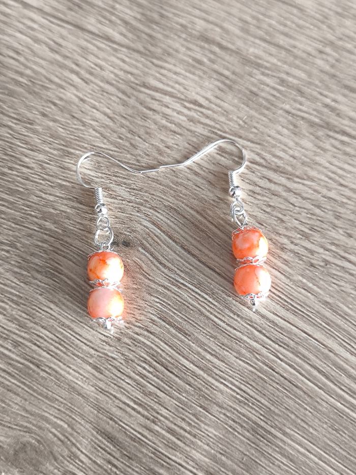 Les boucles d'oreilles sont pendantes avec perles oranges tachetées