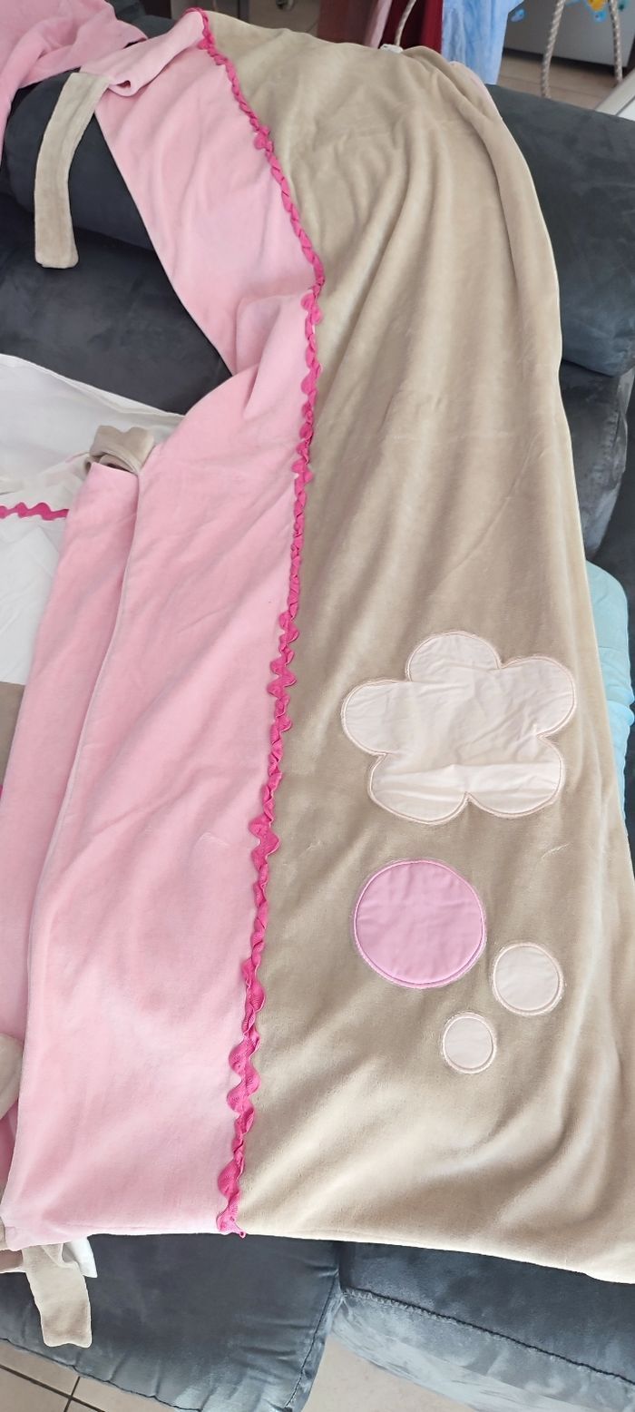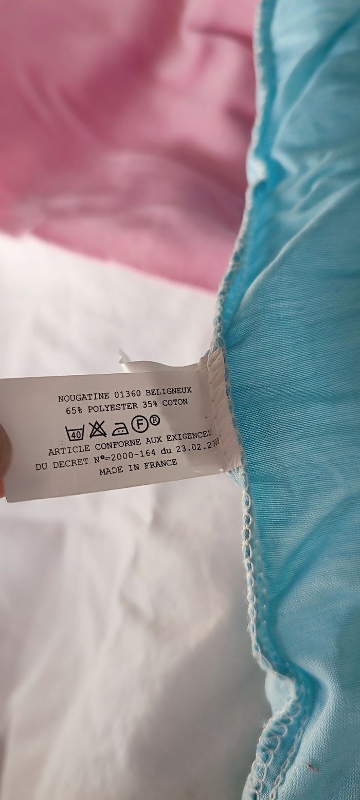 Édredon 57*116 cm+ housse zippée à rebords de 23 cm servi que pour déco avant naissance Taie oreiller,oreiller non fourni 59*40 cm neuve Tour de lit 3 coussins 57*43cm longueur totale 204 cm hauteur 43 cm Drap assorti Maison non fumeur et sans animaux