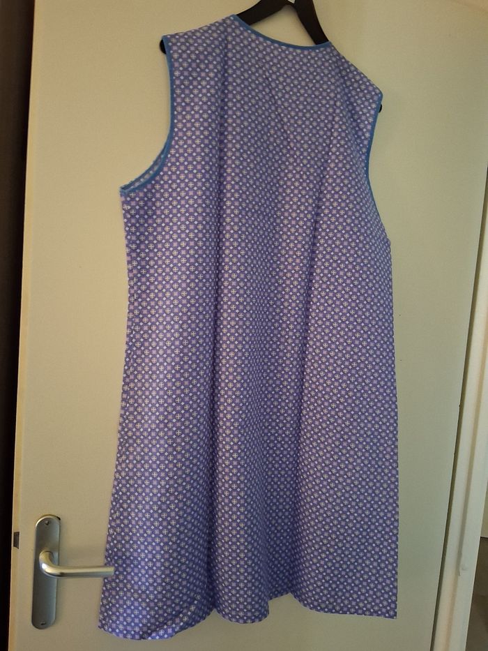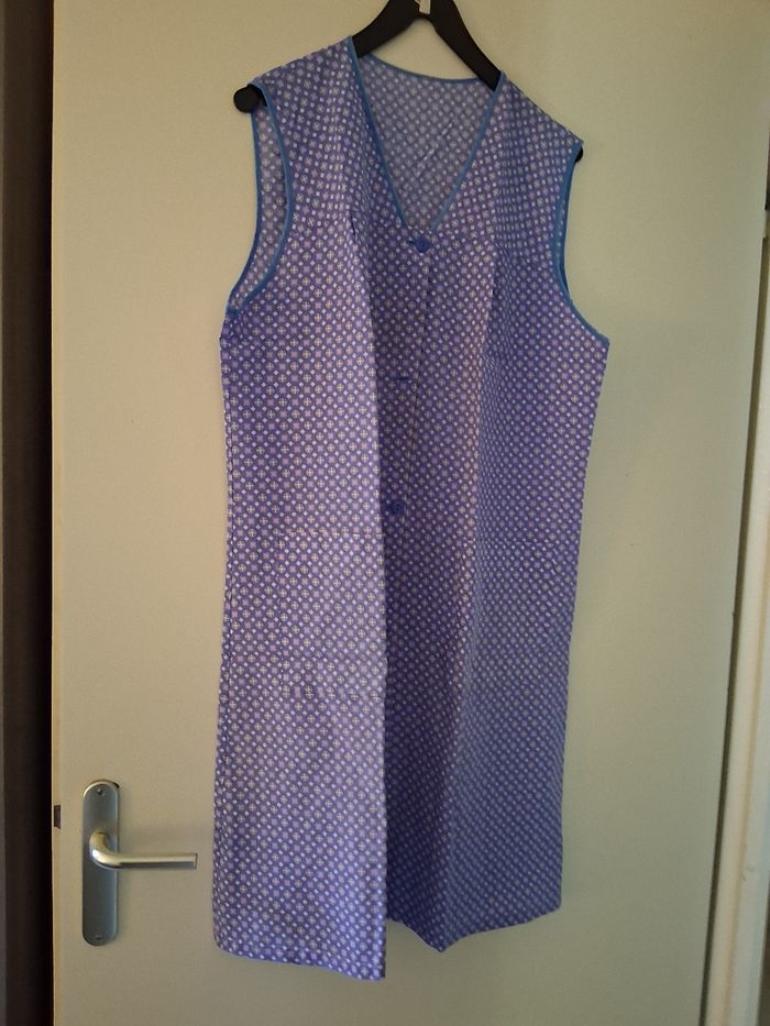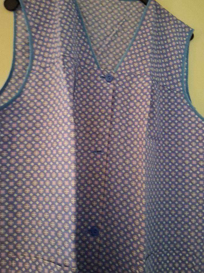 Blouse de cuisine vintage sans manche. Attache bouton. 2 poches.en coton polyester Violet. Rose. Bleu T-"42 -44 sur étiquette État comme neuf