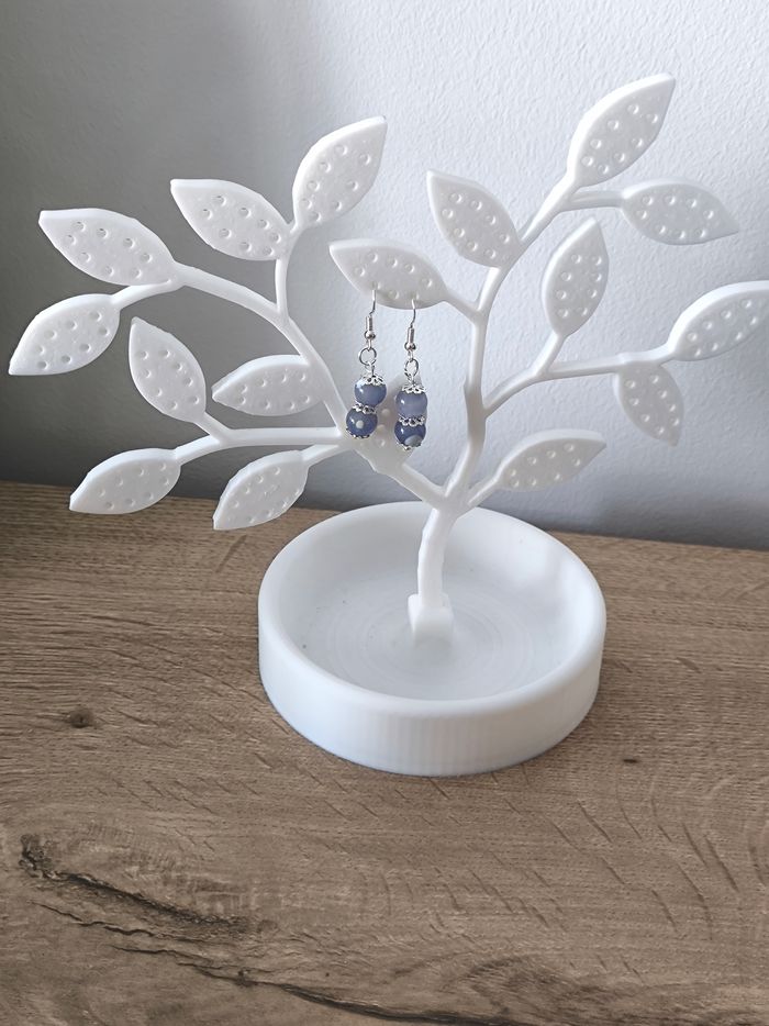 Les boucles d'oreilles sont pendantes avec perles bleues et blanches