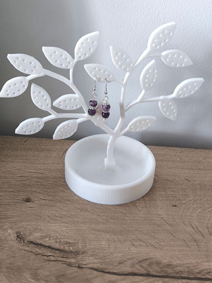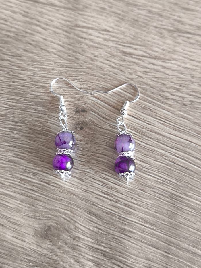 Les boucles d'oreilles sont pendantes avec perles violettes