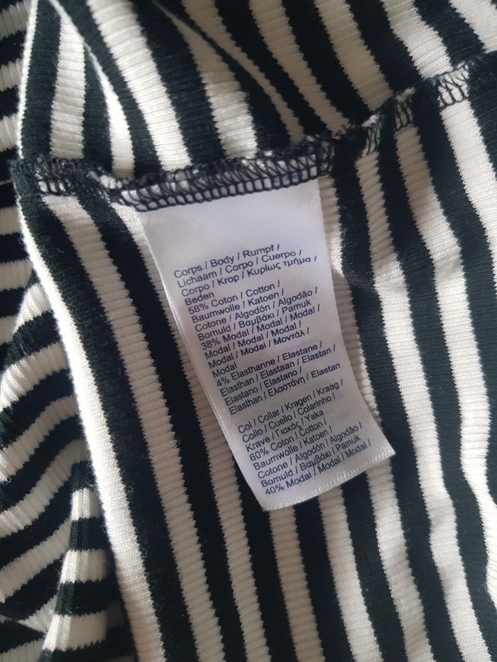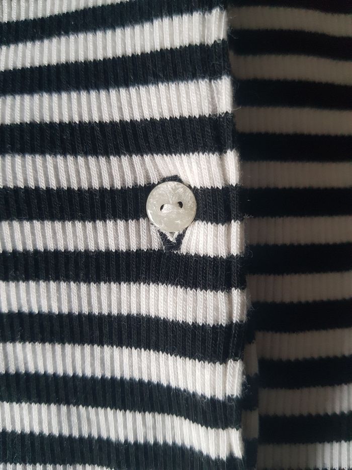 Superbe robe col Polo boutonnée. Marinière noire et blanche. Modèle Lacoste Live. Manche courte finition ondulée et dans le bas de la robe. Crocodile vert emblématique de la marque au niveau du au du dos. Longueur : 89 cm D'aisselle à aisselle : 42 cm Matière mélangée de coton, elasthane et modale. Ref STYLE #EF3368 Très confortable et agréable à porter Envoi rapide et soigné !