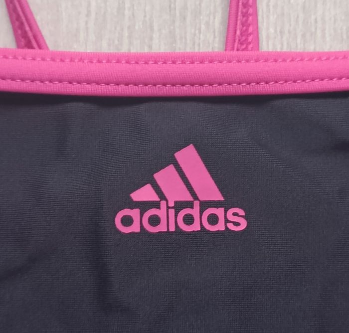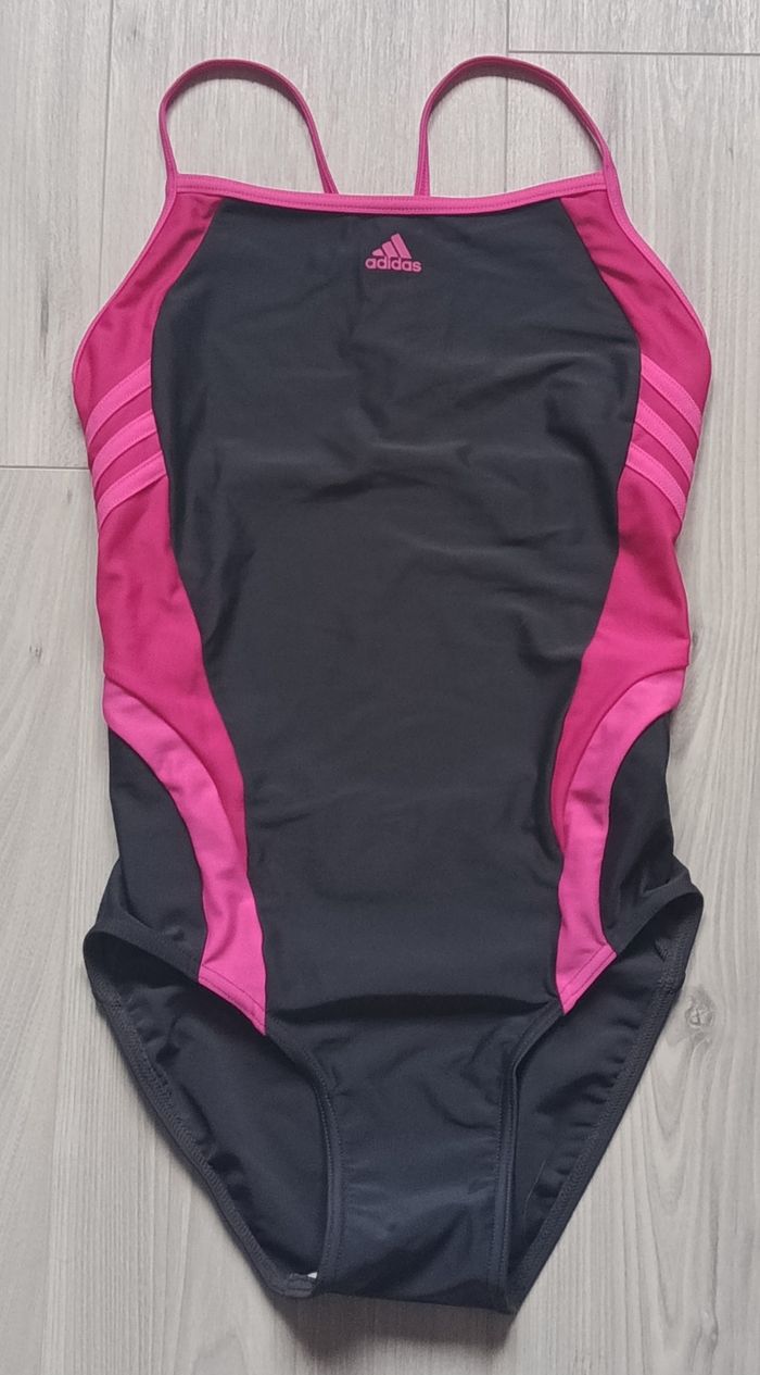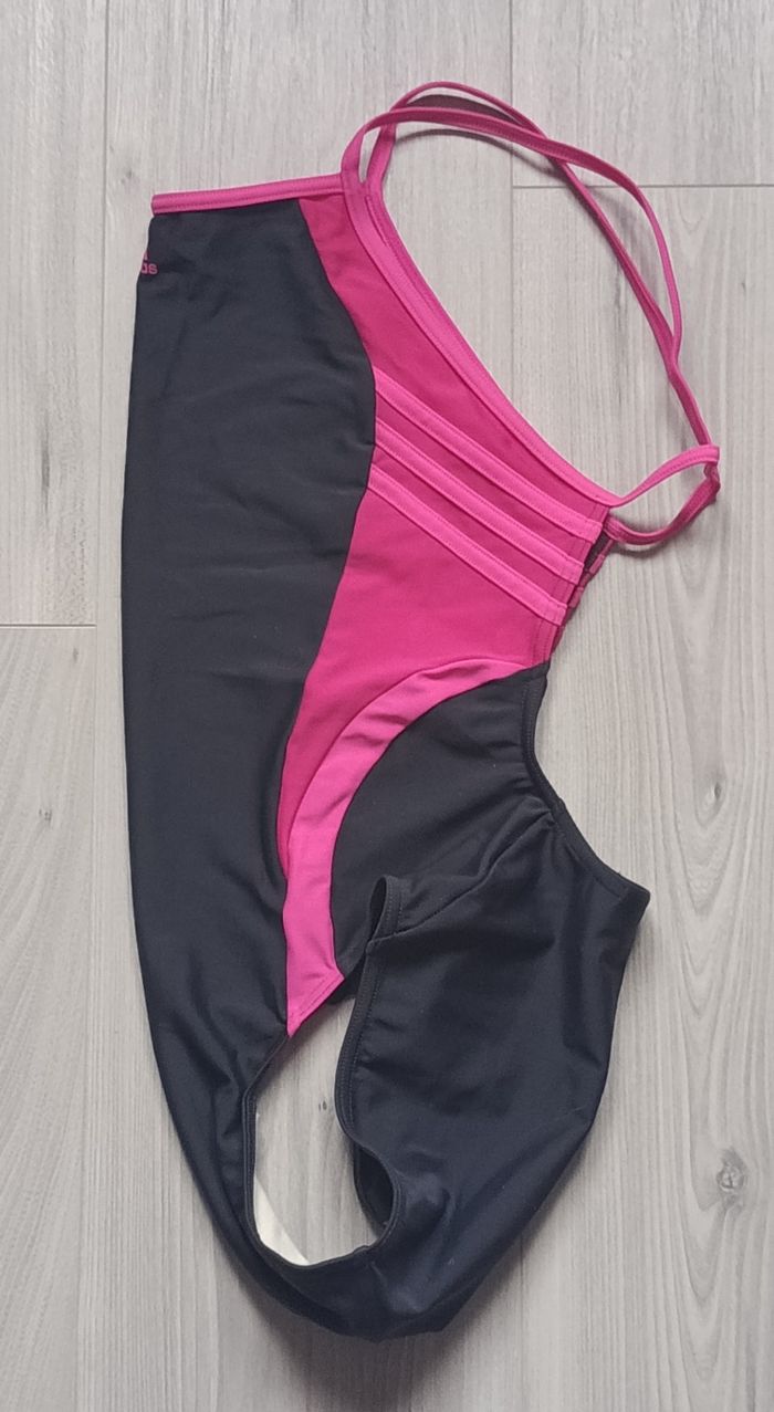 Maillot de bain une pièce de couleurs noire et rose fushia. Fines bretelles. Dos très dégagé. Côtés avec bandes roses sur fond plus foncé. Marque Adidas. Taille 14 ans. Peu porté. En très bon état