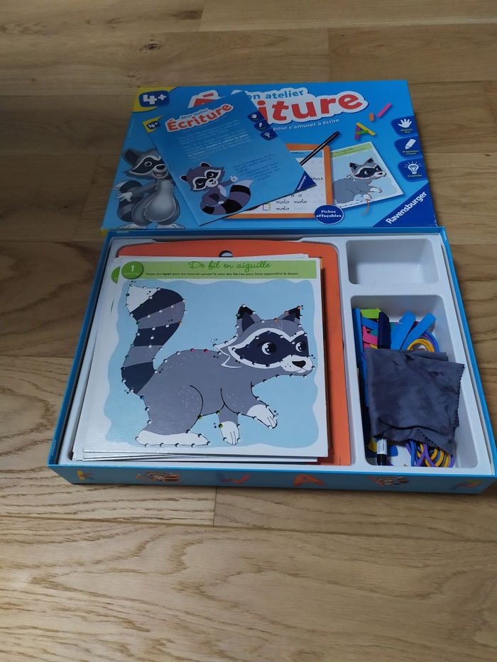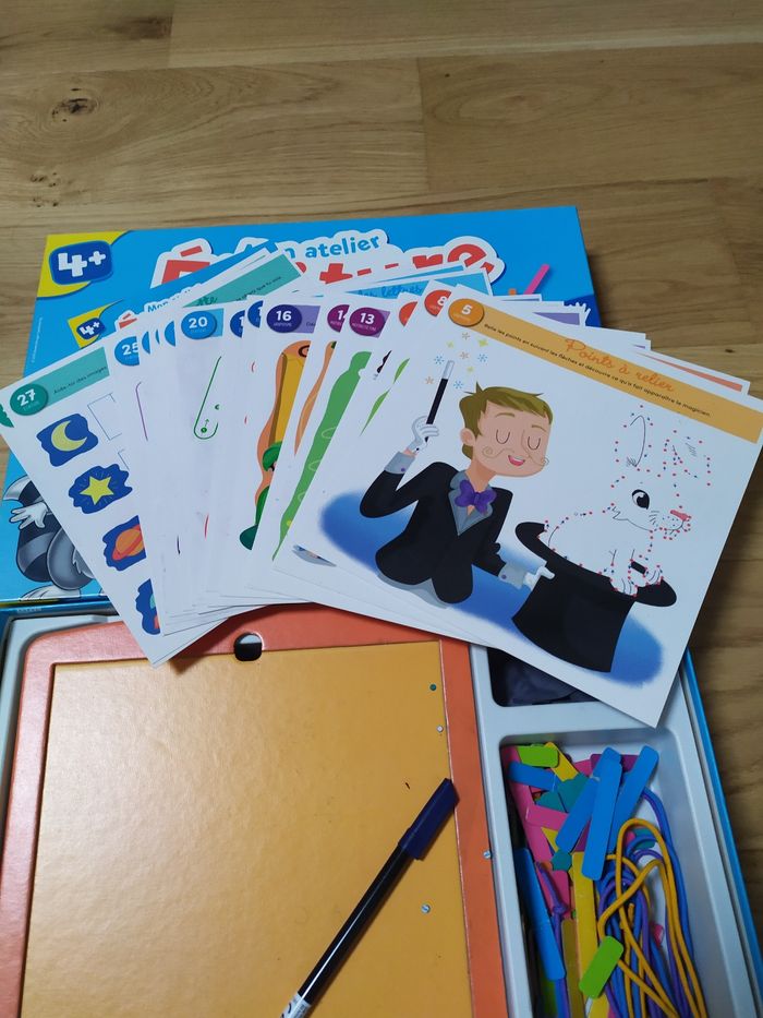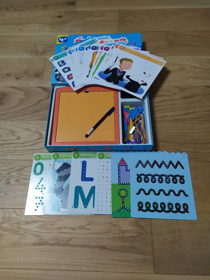 Contient : - 6 fiches cartonnées pour les lacets - 28 fiches d'écriture effaçable ( recto/ verso) - un chiffon - un crayon - 80 bâtonnets en carton. Il manque la pâte à modeler.