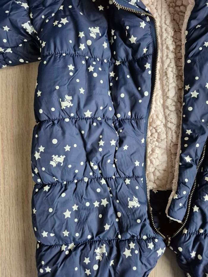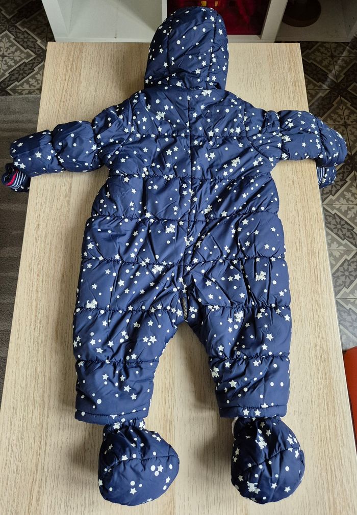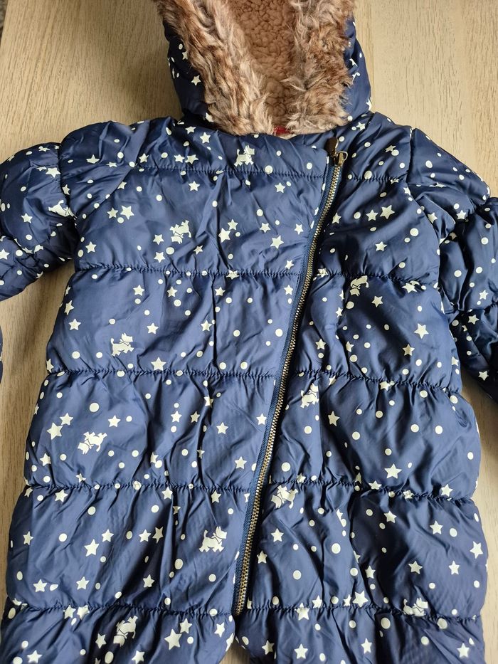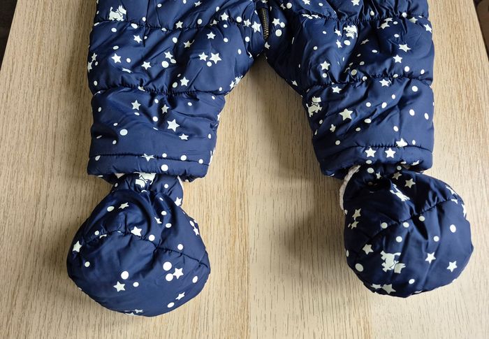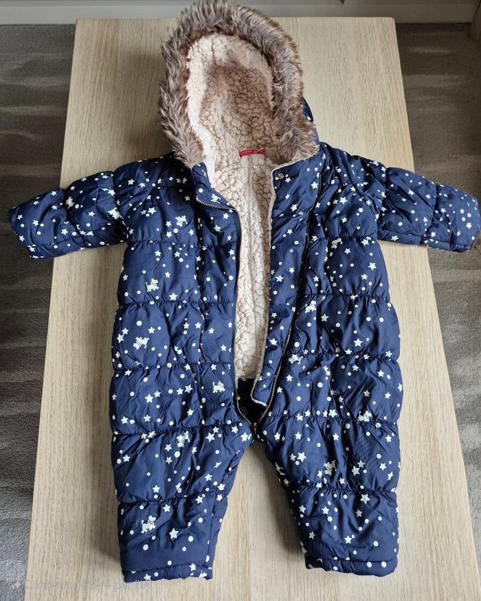 ​À vendre, cette magnifique combipilote pour bébé de la marque Chipie Baby, taille 12 mois. Idéale pour garder votre enfant bien au chaud durant l'hiver ! ​Caractéristiques : - ​Design : Couleur bleu marine avec motif étoiles et petits chiens emblématiques de la marque Chipie. - ​Chaleur : Entièrement doublée en polaire "moumoute" chaude (coloris crème). - ​Protection : Capuche bordée d'une jolie fausse fourrure. - ​Accessoires : Vendue avec ses moufles et ses chaussons amovibles assortis, attachés par pressions pour ne pas les perdre. - ​Praticité : Grande ouverture zippée en diagonale pour un habillage facile et rapide. - État de la doublure : L'intérieur est propre et bien chaud, mais la doublure en "moumoute" présente un aspect moutonné (fibres moins souples qu'à l'origine dues au lavage). Le prix en tient compte. Maison non-fumeur. ​ ​#ChipieBaby #Combipilote #Bébé12Mois #HiverBébé #ManteauBébé #Chipie #VetementBebe #Puériculture #CombinaisonSkiBébé #ModeBébé