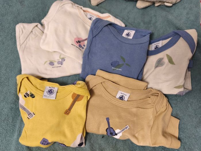 3 t-shirts manches longues 2 pulls 2 gilets 8 bodys manches courtes 8 bodys manches longues 1 salopette 5 pyjamas velours dont 1 deux pièces 2 pantalons 2 ensembles Marque : Kiabi, Orchestra, Sergent Major, Okaidi, Gemo, Petit bateau Soit 35 pièces Peut être séparé, envoyé un MP