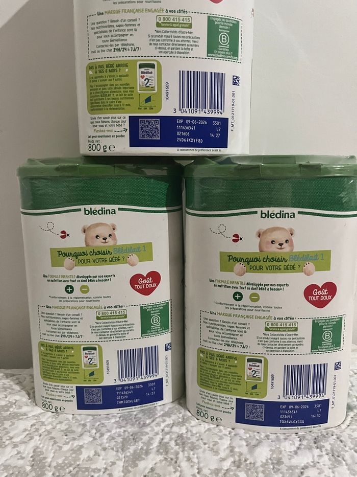 3 boîtes de Lait blédilait à 30€ 1 er age . Valeur magasin 48€ . Neuf Encore fermé sous blister J’en ai trois autres, avec une date de péremption 2027 , les 6 boîtes à 50 € soit une boîte offerte en + !!