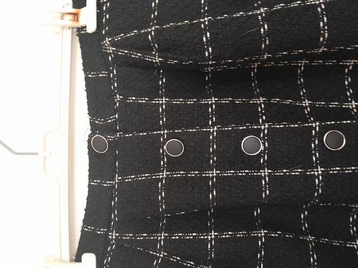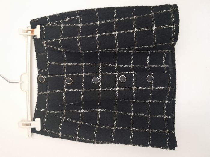 Jupe, à carreaux, 2 fausse poche, attache bouton devant Longueur : 45cm Taille en cm : 36 Matière : 51 % Coton, 49 % Acrylique Marque : Kiabi