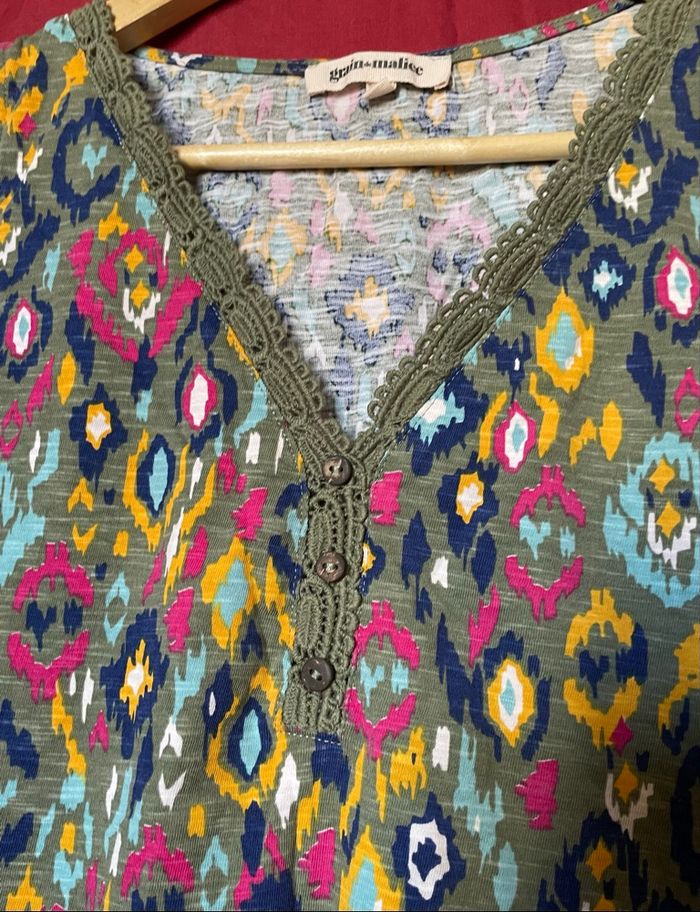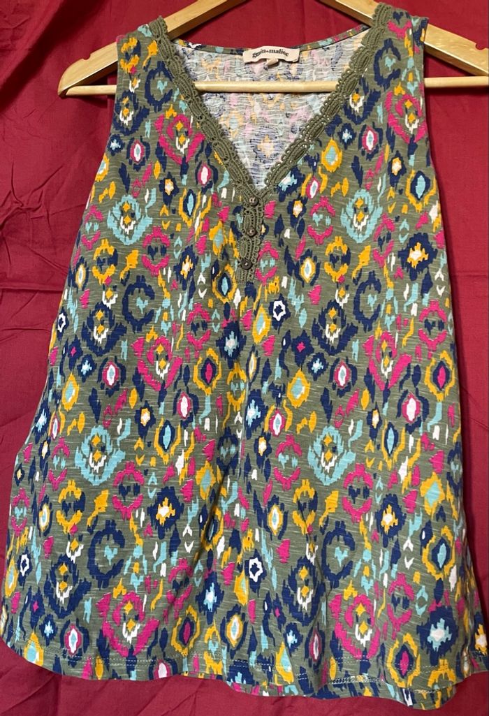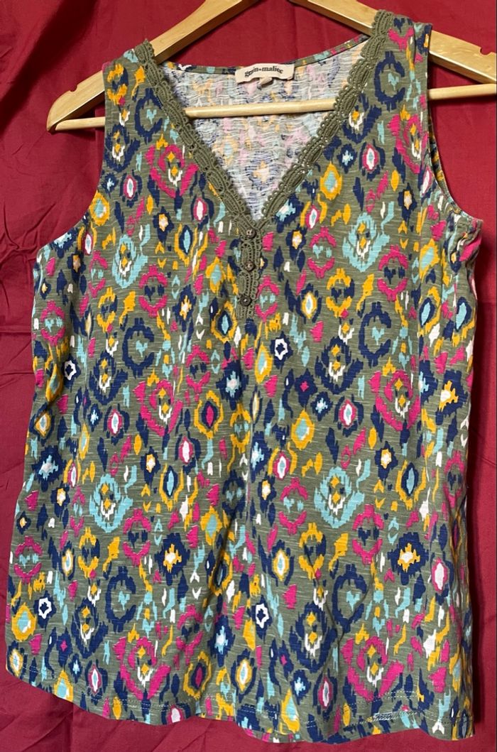 Petit haut sans manche À motif multicolore ( rose, bleu foncé, jaune, blanc et bleu ciel) sur fond vert olive Le col en V est en fil de coton brodé vert olive et décoré de trois petits boutons marrons. Marque : Grain de Malice Taille : M (38) Comme neuf