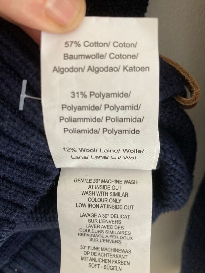Excellent état car peu porté Dos uni sans torsade Hauteur 74cm Largeur aux épaules 48cm Coton polyamide et laine