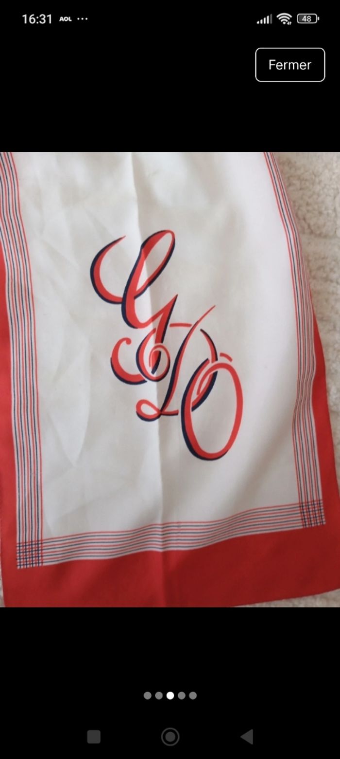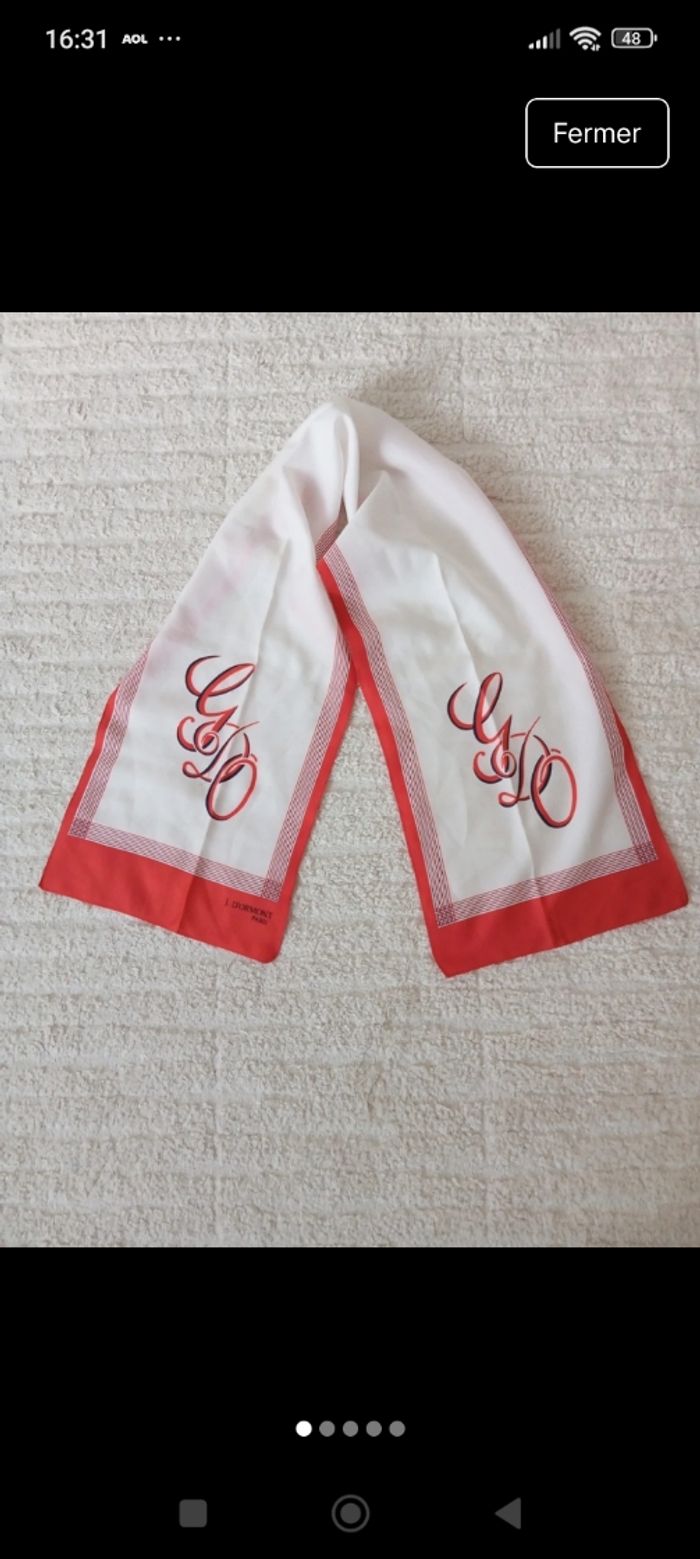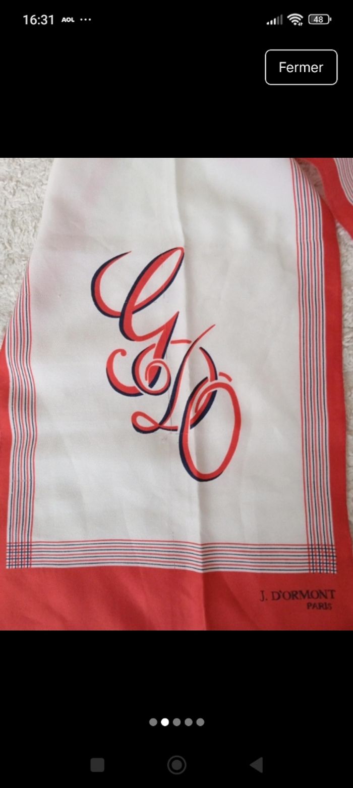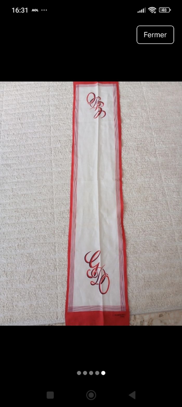 En très bon état juste un fil tire dans les lettres voir photos Couleur blanc rouge Taille 26 cm large et 130 cm long Marque j.d'ormont paris