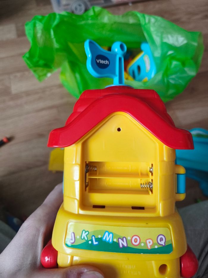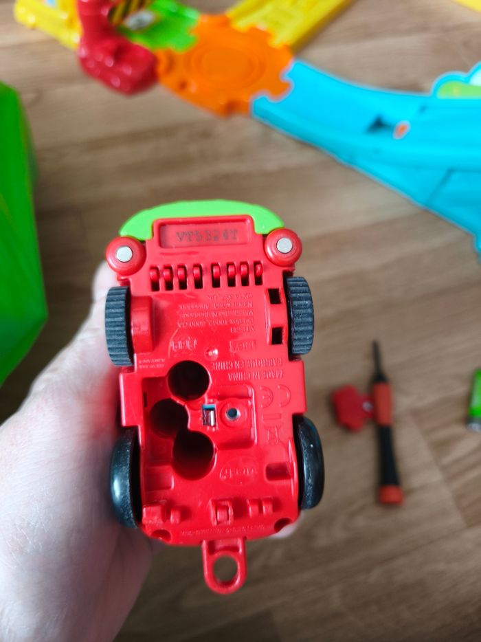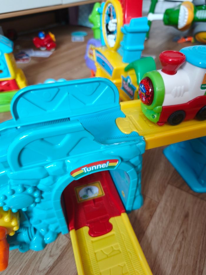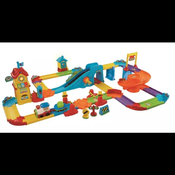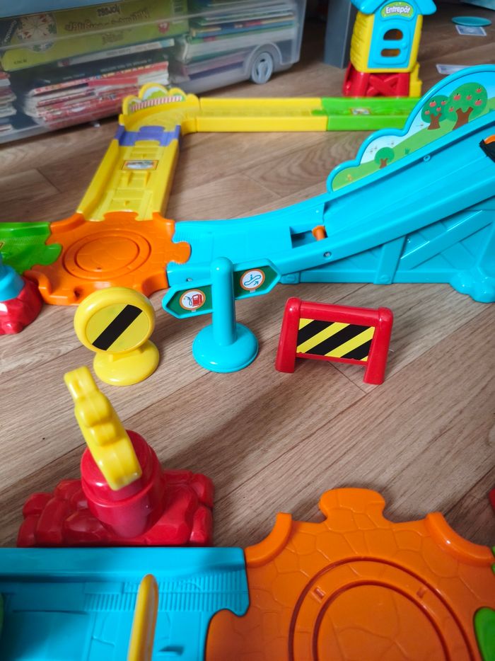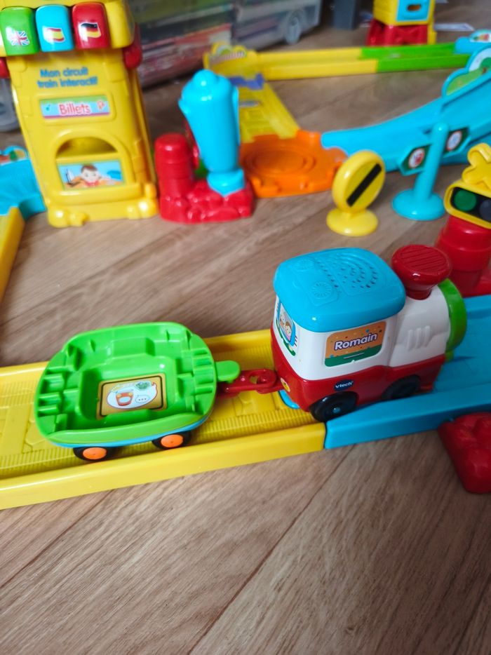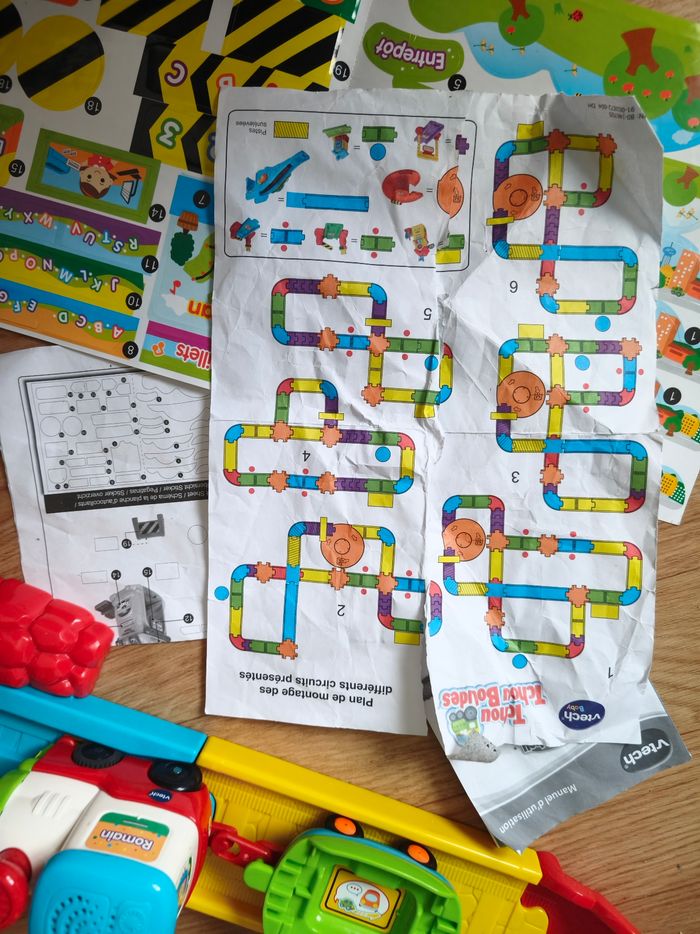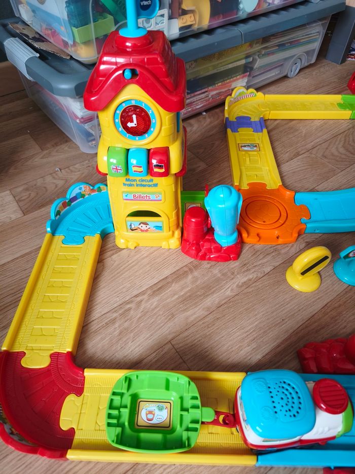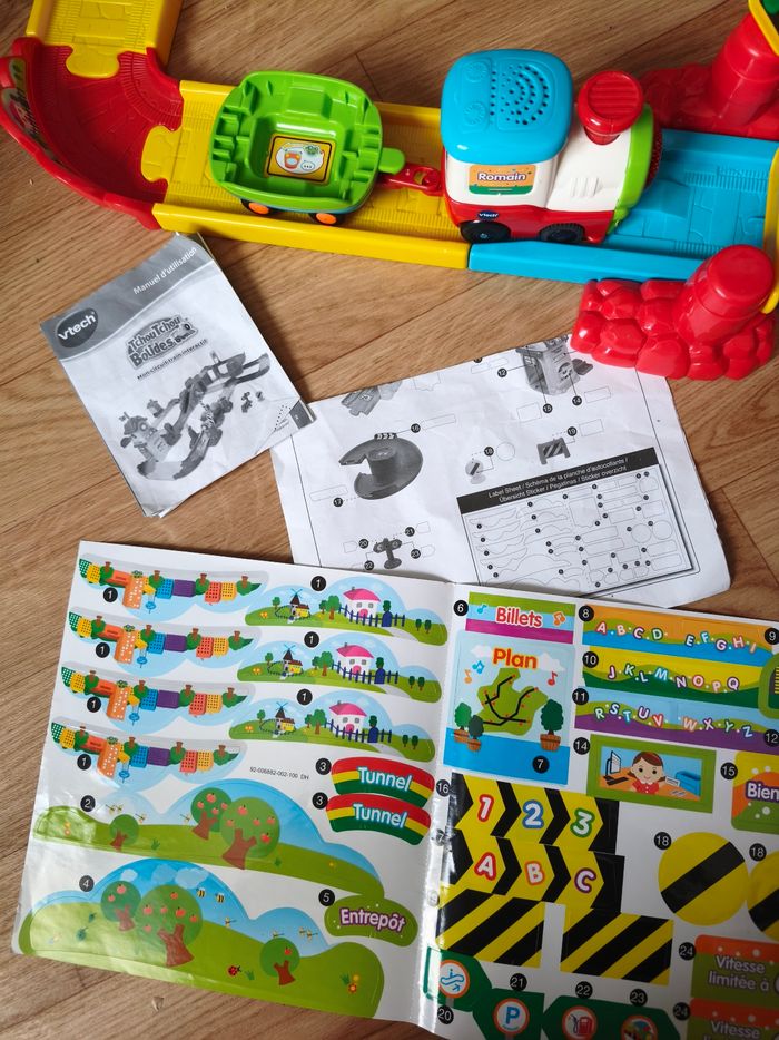 Grand circuit Complet La descente est cassée et il manque le caoutchouc 1 planche d'autocollants, la notice et des idées de circuits Le train fonctionne, vendu sans piles