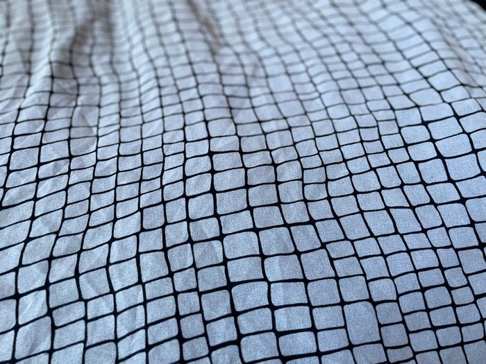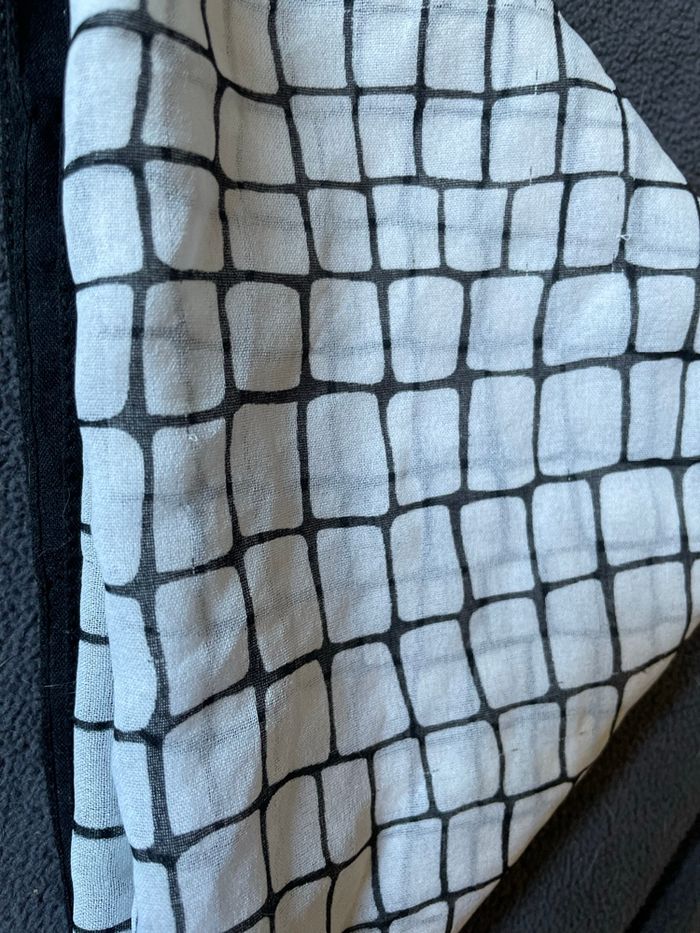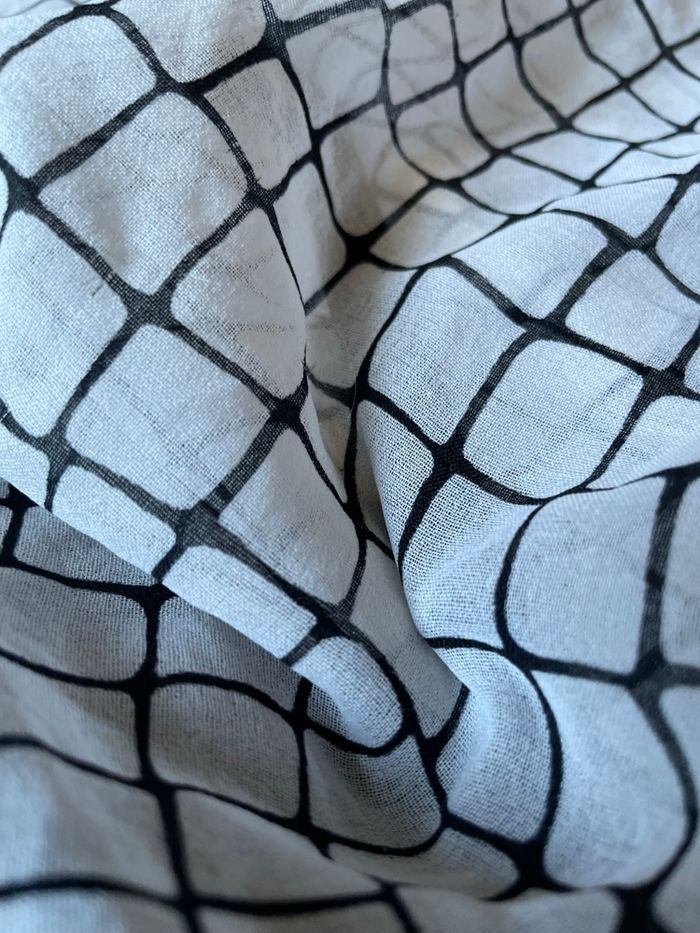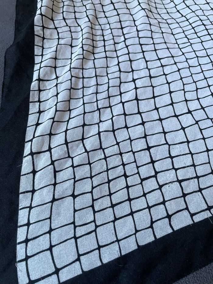 Carré noir & blanc Carrés blancs ornés de noir Et le contour du foulard est bordé de noir (3 cm) Très léger Dimension : 70 X 70 cm Occasion/ bon état Sans étiquette