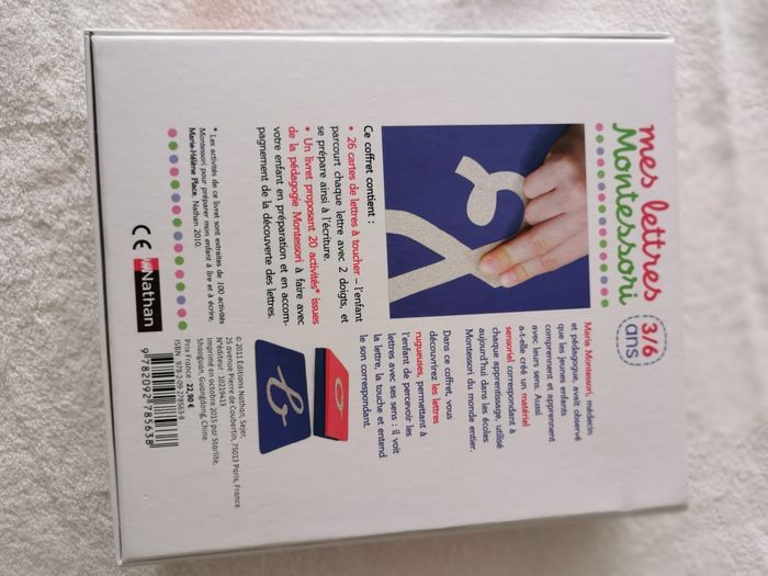 26 cartes à toucher pour se préparer à lire et à écrire ! Un coffret pour découvrir les lettres d'après la méthode Montessori, fondée sur la découverte visuelle mais aussi tactile des lettres. Les écoles Montessori utilisent des " lettres rugueuses " : l'enfant les regarde et les touche pour apprendre à la fois leur tracé et leur son. Dans ce coffret vous découvrirez les lettres rugueuses, permettant à l'enfant de percevoir les lettres avec ses sens : il voit la lettre, la touche et entend le son correspondant. L'enfant les mémorise mieux car plusieurs sens sont sollicités. Le coffret contient le matériel Montessori suivant : - 26 cartes de lettres à toucher : l'enfant parcourt chaque lettre avec 2 doigts, et se prépare ainsi à l'écriture. - Un livret proposant 20 activités issues de la pédagogie Montessori à faire avec votre enfant avec ce matériel. #stephanie89240jeu #stephanie89240apprentissage