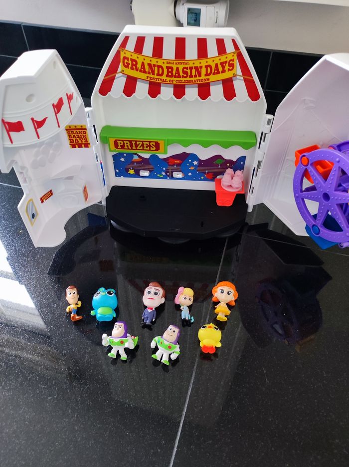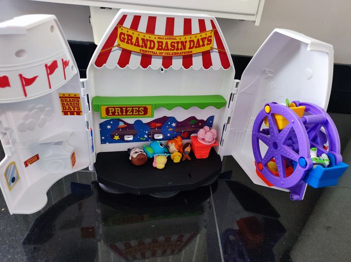 Coffret de jeu, décor et mallette de rangement Buzz l’Éclair de Disney Pixar Toy Story 4 en un seul jouet Design extérieur Star Command, mallette carnaval Star Adventures avec circuits à l’intérieur Le décor peut accueillir jusqu’à 15 mini-figurines Se ferme pour se transformer en mallette avec poignée pouvant contenir 20 mini-figurines 8 Figurines : buzz l' éclair*2, la bergère, Woody,canard,... Mattel Très bon état J' ai d autres jouets enfants