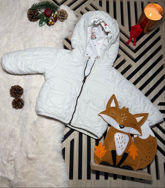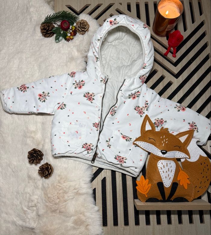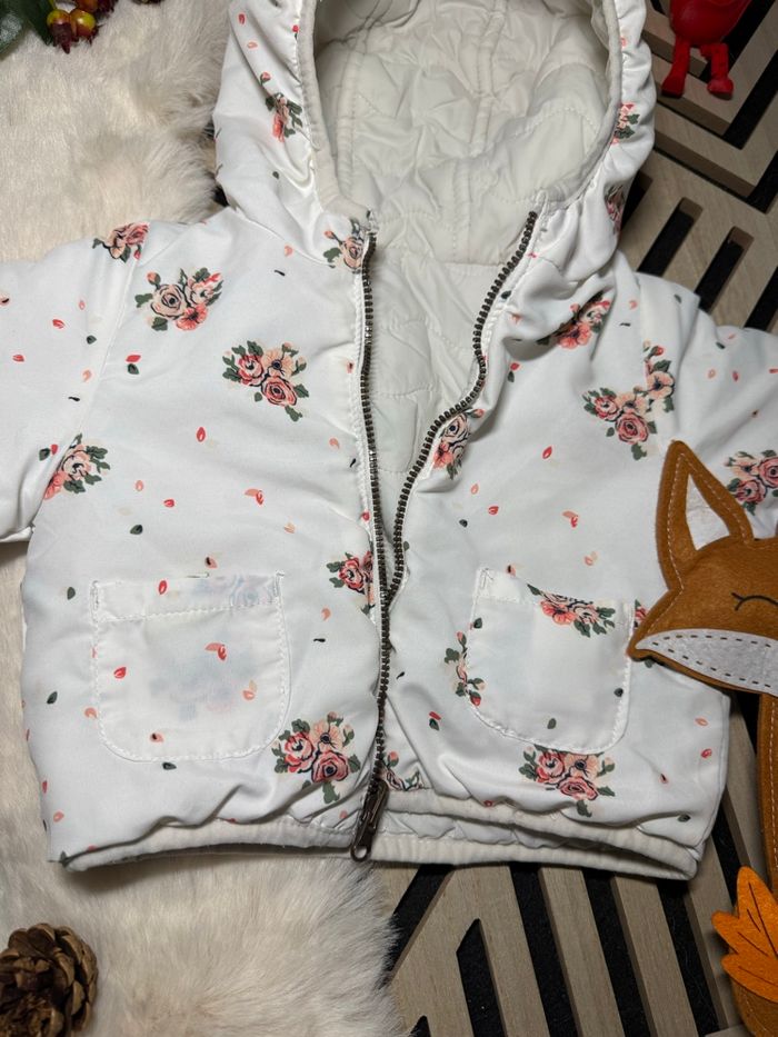 Manteau réversible Tape à l’œil , 6 mois. Un côté blanc et un côté fleuri très mignon Très bon état
