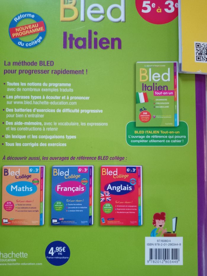 Lot de 3 livres d'italien, pour bien débuter la langue, de la 5ème à la 3ème. Attention le bled italien juste la page 4 et 5 a été remplie. Prix estimé en magasin pour ces 3livres :14€75