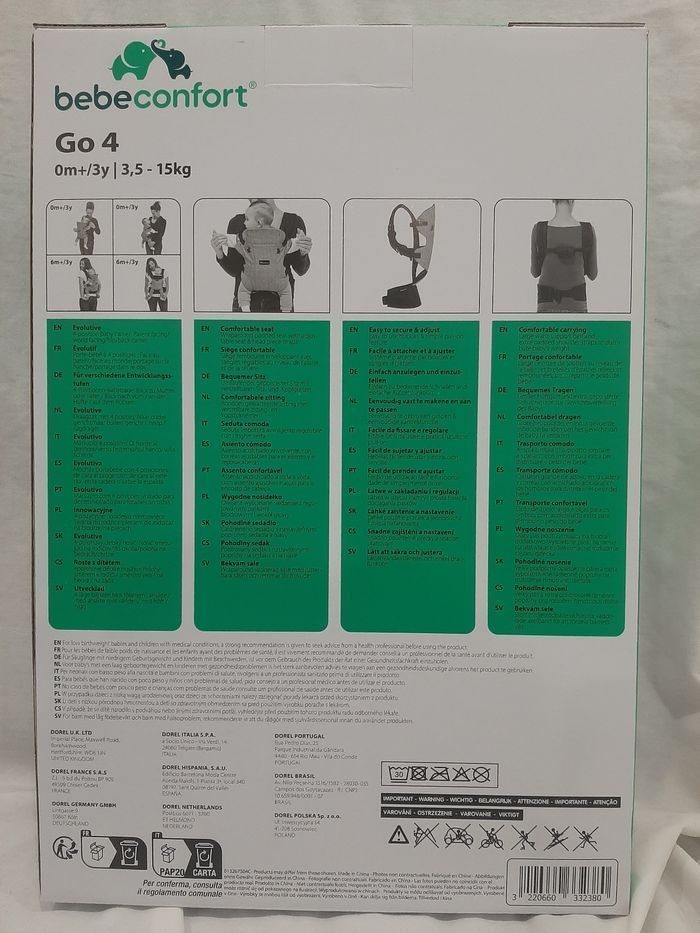 Porte-bébé Go4 Jamais utilisé Convient dès la naissance et jusqu’à environ 3 ans (poids maximum : 15 kg). Léger et confortable, facile à utiliser au quotidien Caractéristiques : Poids : environ 810 g Dimensions : environ 99,5 × 47 × 75,5 cm