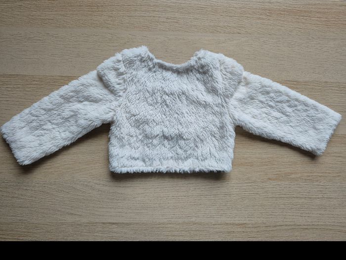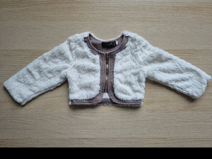 Boléro / Gilet en fausse fourrure blanche Chicaprie - 12 moisVends ce ravissant petit boléro à manches longues de la marque Chicaprie. Parfait pour compléter une tenue de cérémonie (baptême, mariage) ou pour garder bébé bien au chaud avec élégance.