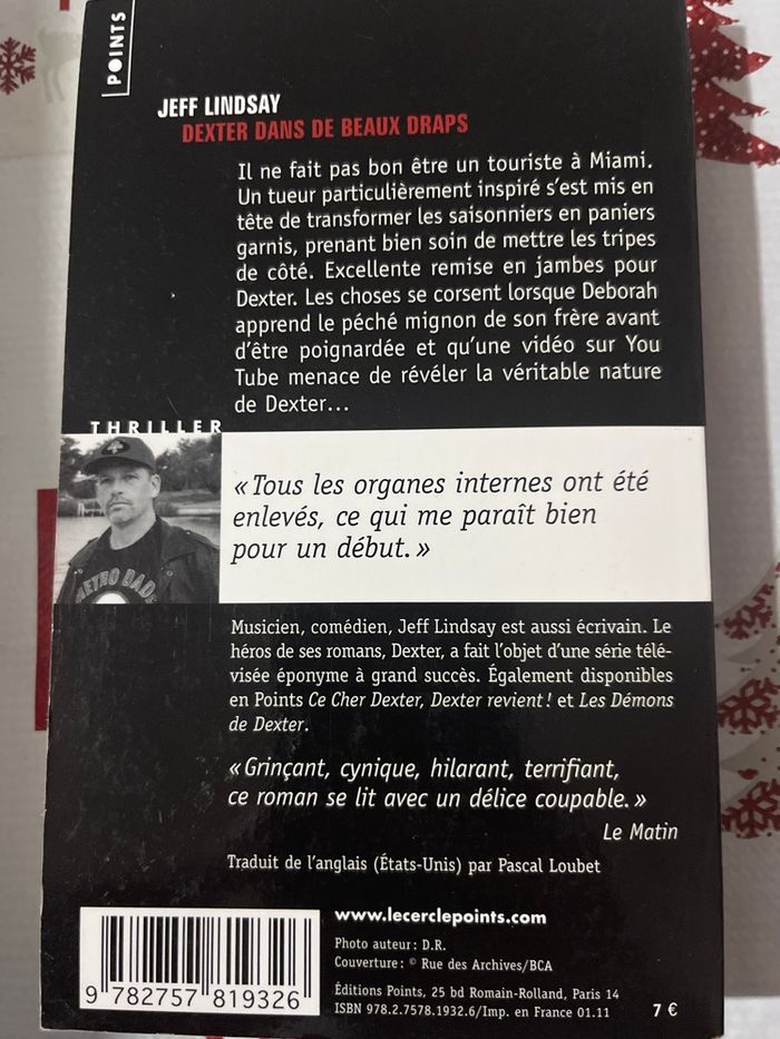 Dexter dans de beaux draps – Jeff Lindsay Plongez dans l’univers sombre et captivant de Dexter, le héros d’une série télé à succès ! À Miami, un tueur particulièrement inspiré sème la terreur, et Dexter doit faire face à des situations de plus en plus dangereuses. Suspense, humour noir et rebondissements garantis dans ce thriller haletant. Livre en bon état, parfait pour les fans de thrillers et de la série Dexter. Prix : 1 € Envoi rapide et soigné.