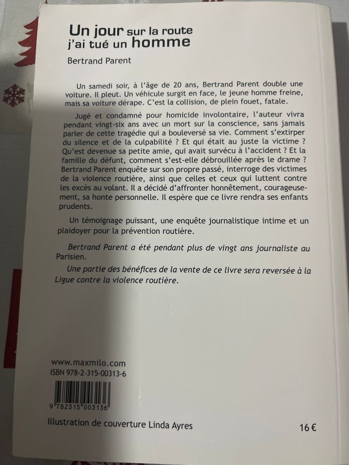 Un jour sur la route j’ai tué un homme – Bertrand Parent Un témoignage poignant et intime d’un homme confronté à un drame qui a bouleversé sa vie. À 20 ans, Bertrand Parent est condamné pour homicide involontaire après un accident fatal. Pendant vingt-six ans, il porte ce poids, interrogeant victimes et coupables, dans une enquête humaine et un plaidoyer fort pour la prévention routière. Livre en état satisfaisant, idéal pour ceux qui cherchent un récit vrai et engagé. Prix : 1 € Envoi rapide et soigné.