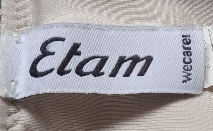 Beau maillot de bain deux pièces de couleurs beige et marron à motifs léopard. Le haut se porte comme un bandeau à nouer dans le dos, avec emplacement poitrine légèrement marqué. Bas très échancré. Marque Etam. Taille 36. Peu porté. En très bon état
