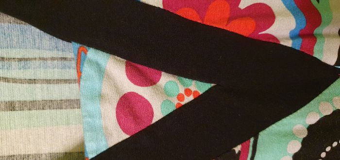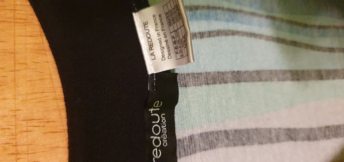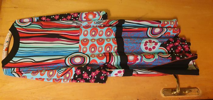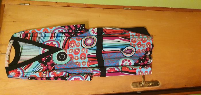 Joli robe à motifs de La Redoute Création, taille 50/52, 95% viscose, 5% élasthanne, manches 3/4 de 40cms, décolleté en V avec une pointe modestie bordée d'un biais noir repris en bande sur la jupe basse, base légèrement asymétrique, largeur d'aisselle à aisselle 56cms, largeur à la bande (hanches) 56cms, robe droite, longueur 102cms.