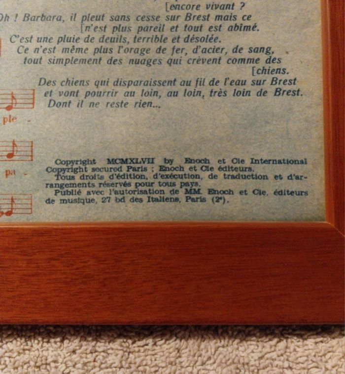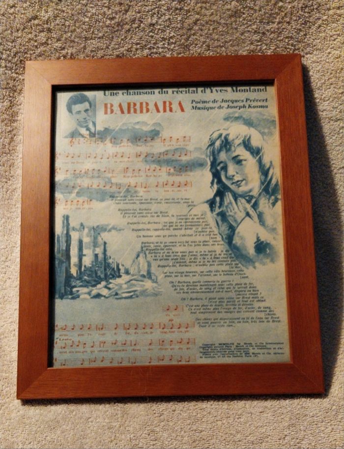 ancienne affiche sous cadre mural partition Barbara Jacques Prévert Récital Yves Montand