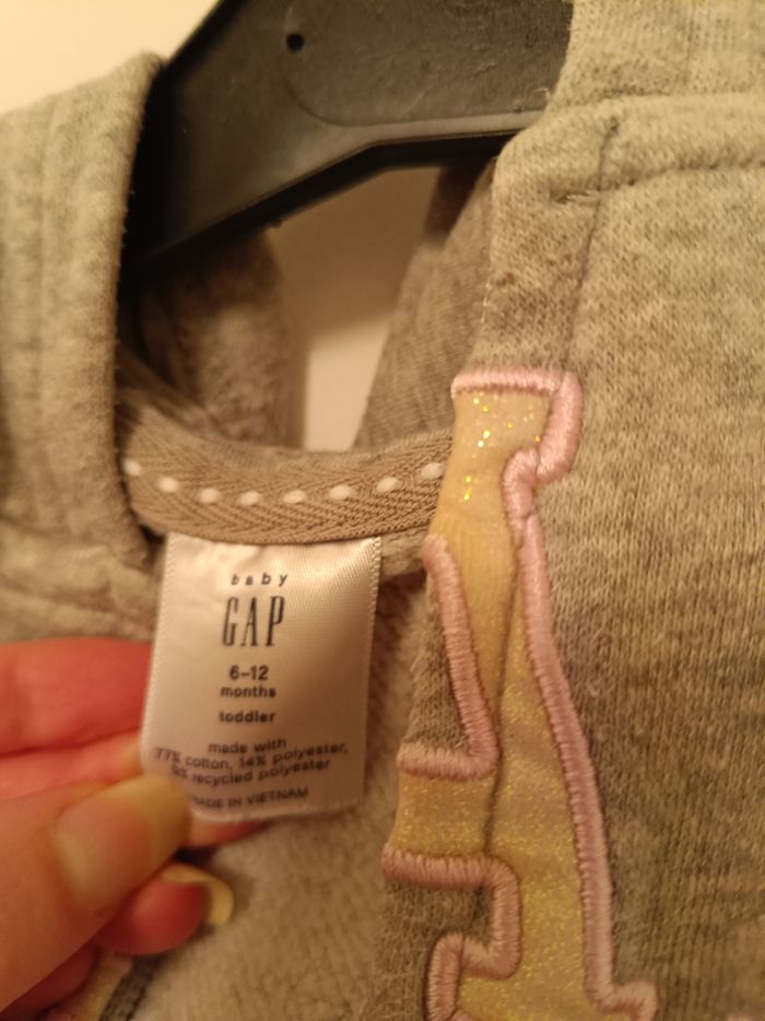 joli gilet à capuche (hoodie) de la marque Baby GAP en excellent état. Taille : 6-12 mois (toddler). Couleur : Gris chiné avec logo GAP brodé en rose clair à finitions pailletées. Détails : * Fermeture éclair sur toute la longueur (pratique pour habiller bébé). Doublure douce et chaude. Deux poches à l'avant. Composition : 77% coton / 23% polyester (matière confortable et résistante). État : Très bon état, propre et bien entretenu