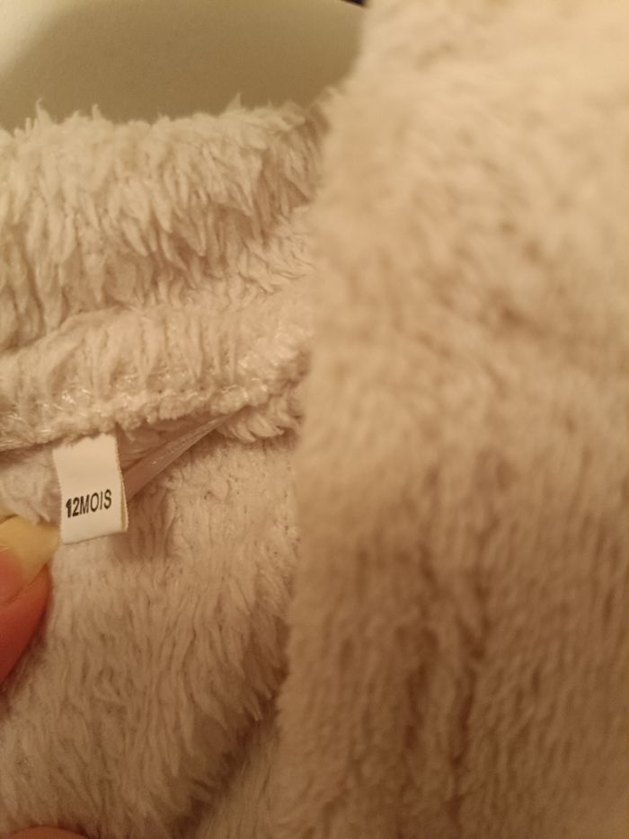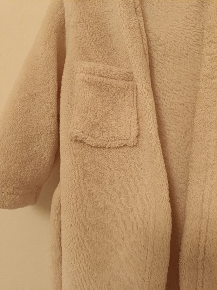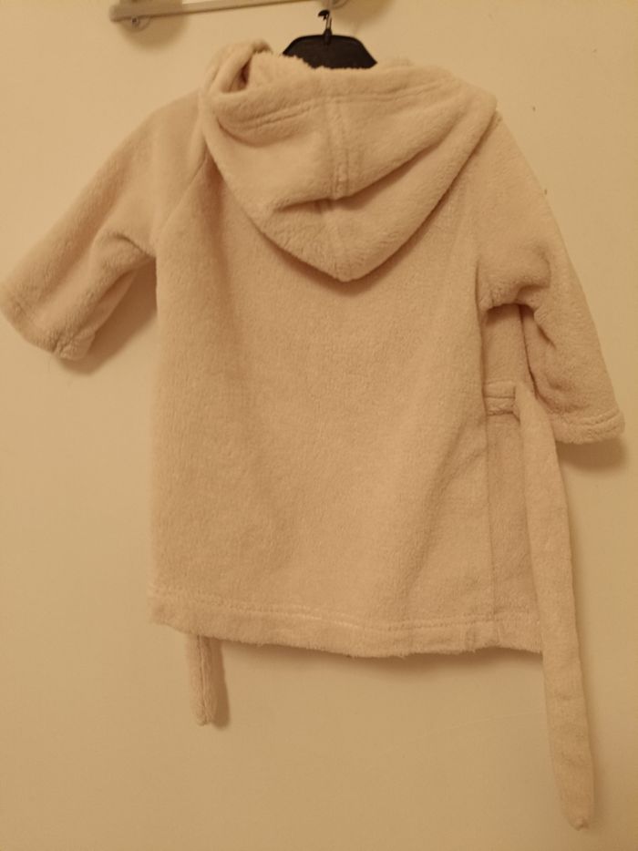 peignoir pour bébé ultra moelleux, idéal pour la sortie du bain ou les matins cocooning. Taille : 12 mois. Couleur : Beige / Crème. Matière : Texture "peluche" très douce au toucher. Détails : Capuche intégrée pour garder la tête bien au chaud. Ceinture assortie cousue au dos (pour ne pas la perdre). Petite poche plaquée sur le devant. État : Très bon état, la matière est restée bien souple.