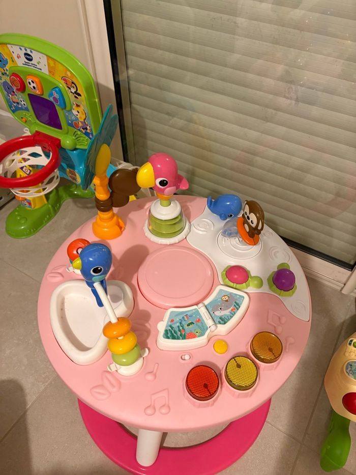 -Table d’activité en très bon état -Boutons sons et lumières -10 activités luses: mode batterie ou chansons, perroquet qui tourne, baleine à bascule, singe surfeur,…. -Éveil de bébé avec de la musique, des lumières et des jouets qui bougent dans tous les sens - Âge : a partir 6 mois