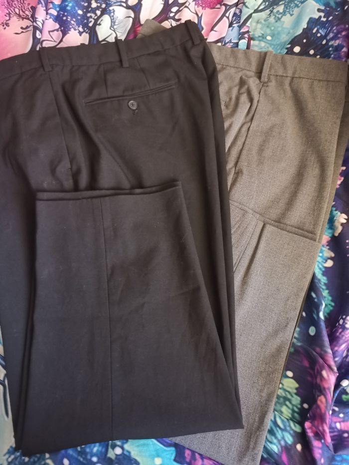 lot de 2 pantalons homme - coupe classique - un noir et un gris moyen - taille XL -3- correspondant à un 44-46 - jambes ajustées pour un homme d'1m 70 - longueur totale 91 à 92 cm - peu portés. - 60% polyester - 28% viscose - 3% élastane