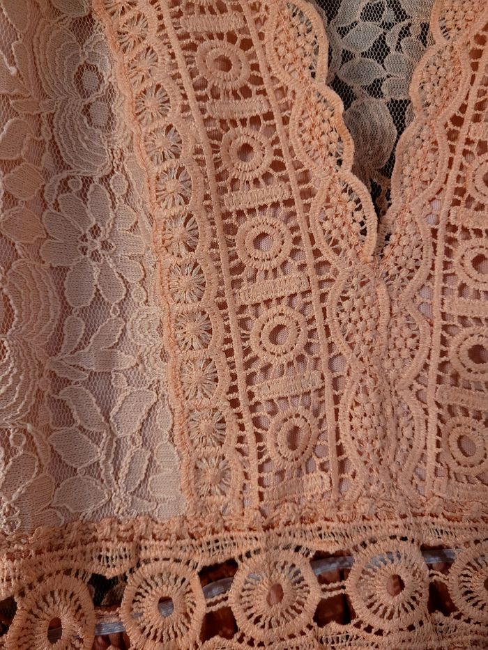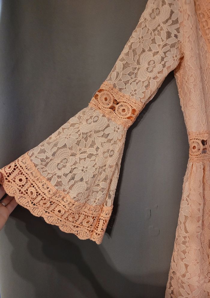 Robe courte en dentelle, de couleur corail, bras et dos en transparence, de la marque Lilie Rose, taille S/M, en très bon état. Article lavé pour la vente.