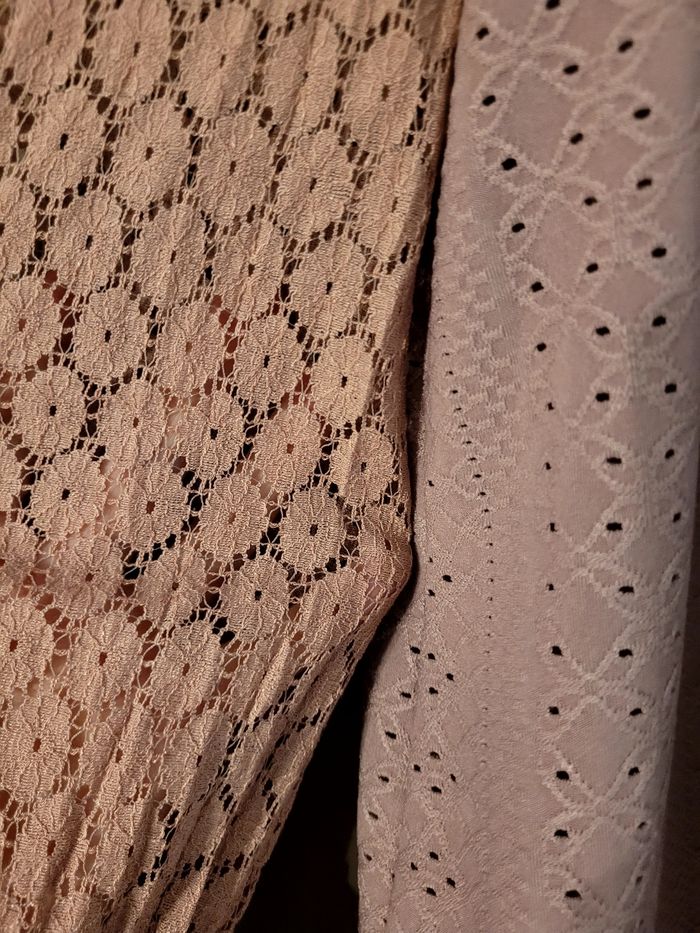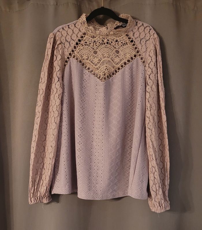 Blouse dans les tons vieux rose, détails en transparence et dentelles, taille 36, en très bon état. Article lavé pour la vente.