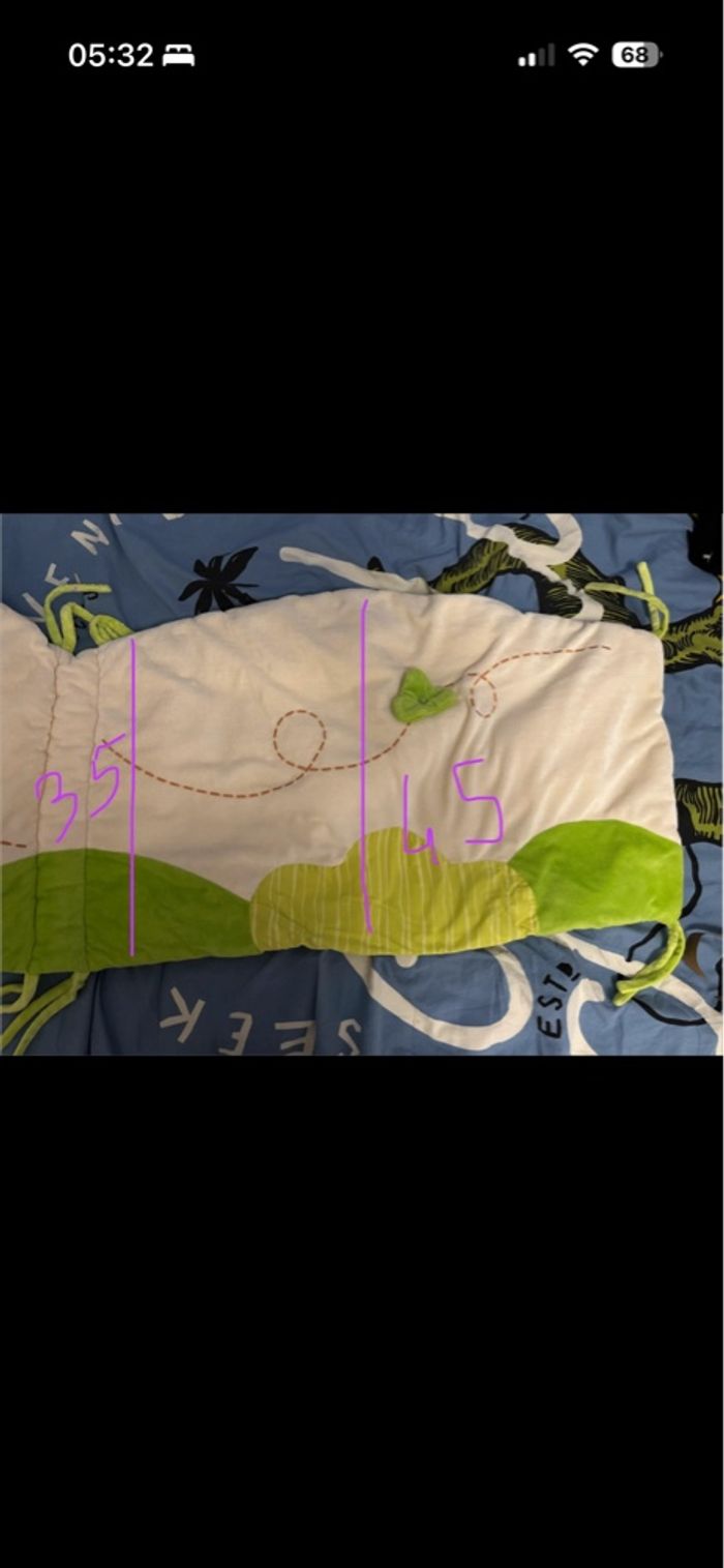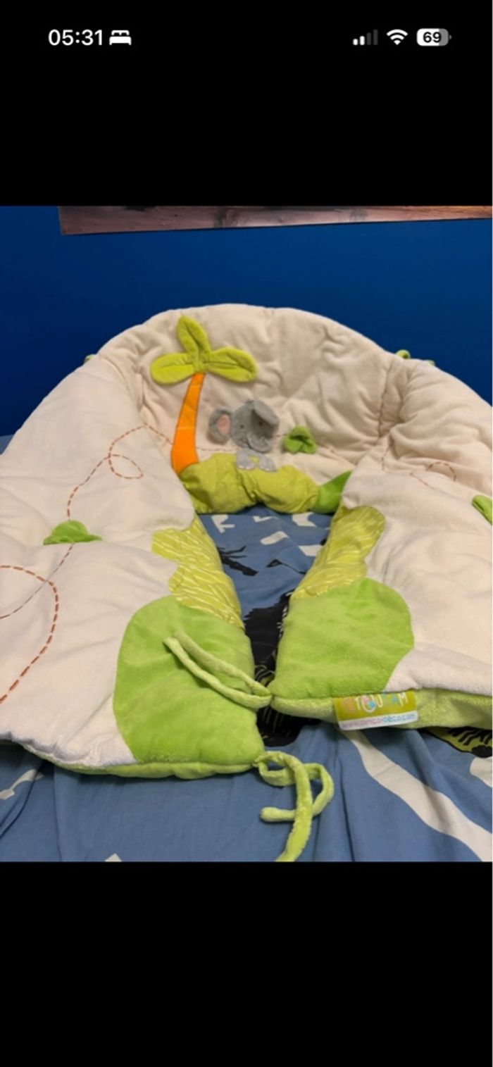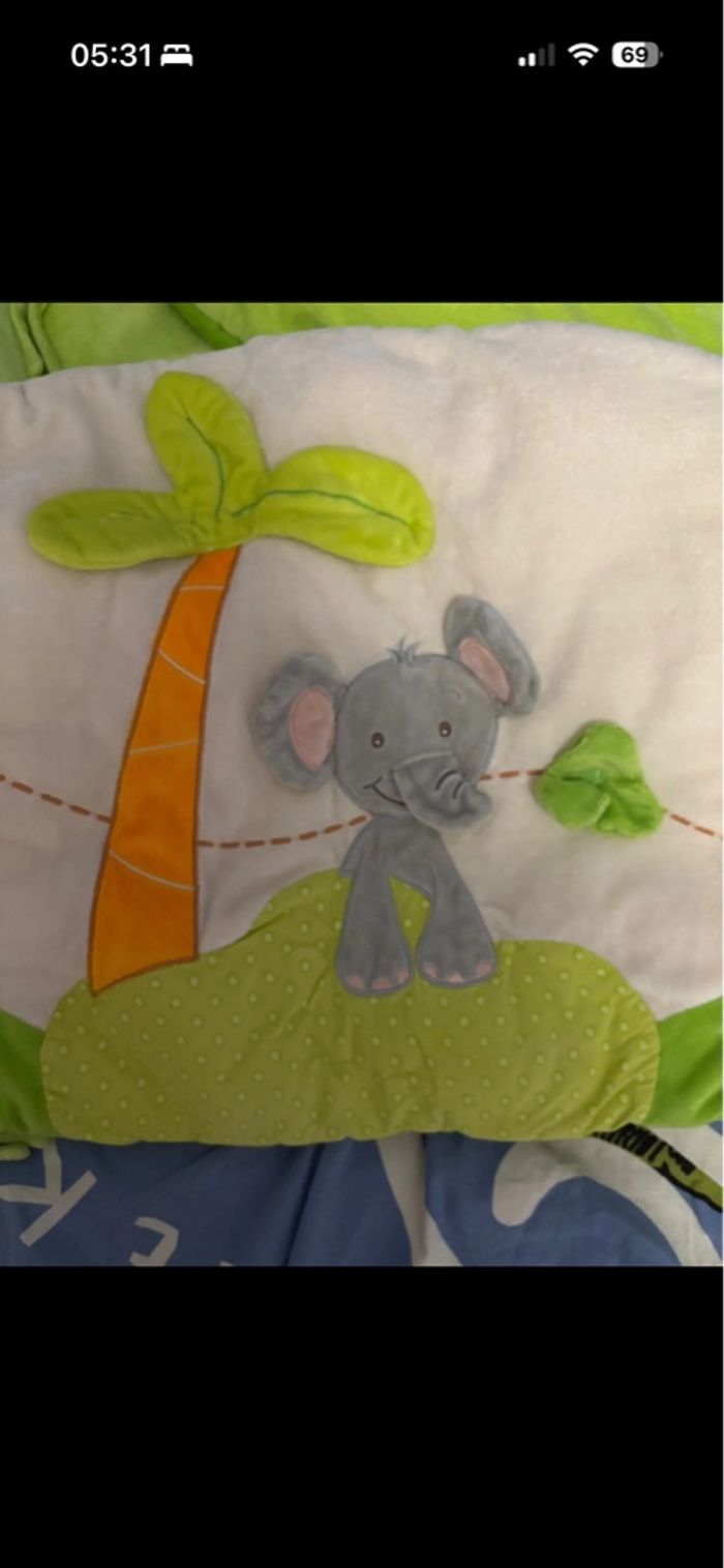 Titoutam Motif éléphant/ savane. Matière toute douce. Certaine pièce sont en relief comme les oreilles et la trompe qui bougent. Longueur total 2m En hauteur au plus bas 35cm et au plus haut 45cm.
