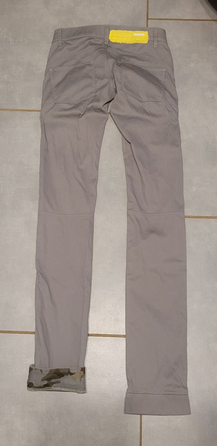 Jean ajusté, de couleur kaki, avec bas des jambes retroussables avec motif militaire, de la marque Guru, taille W25, équivaut à un 34/36, en très bon état. Article lavé pour la vente.