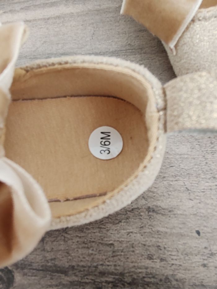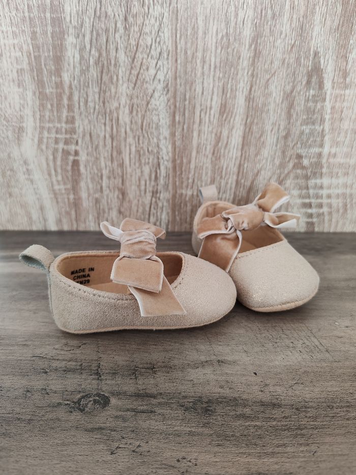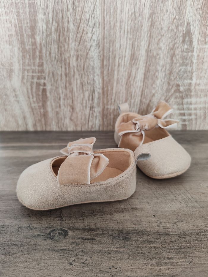 Chaussons de naissance bébé fille ballerines à paillettes et noeud fantaisie doré. Gémo, taille 3/6 mois, très bon état.