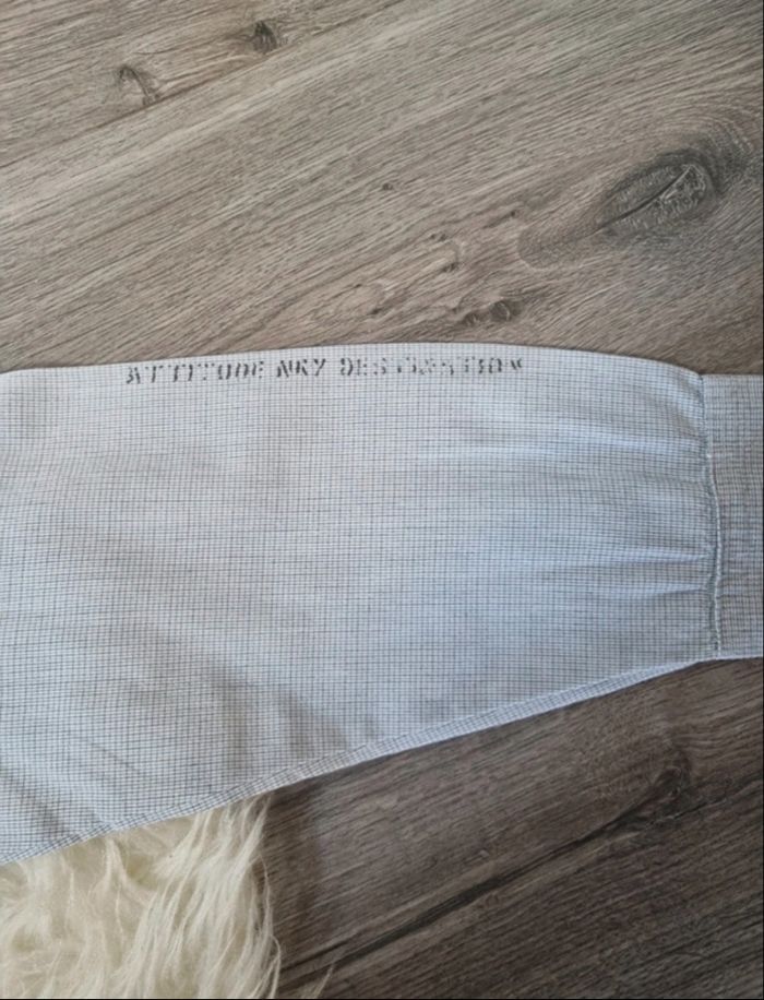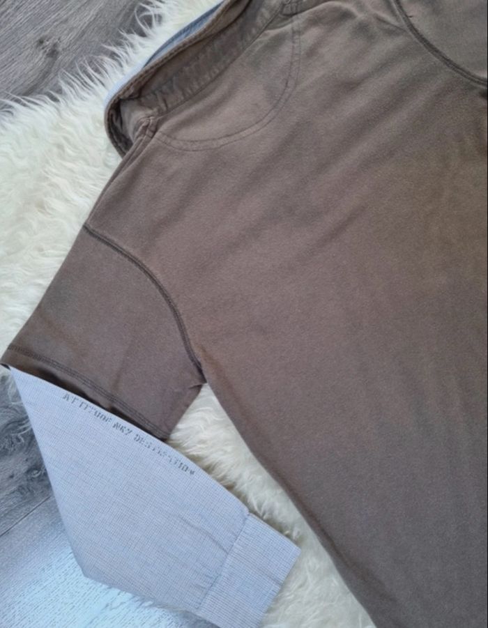 Tee-shirt à manches longues pour garçon Ettet 2 en 1 : style Tee-shirt rapporté sur chemise Double cols superposés, ouverture en V Poignets fermés par boutons imitation chemise Petites fentes côtés 100 % coton coloris taupe / bleu ciel (motifs petits carreaux très discrets) Impression poitrine En très bon état Taille 10 ans = 138 cm
