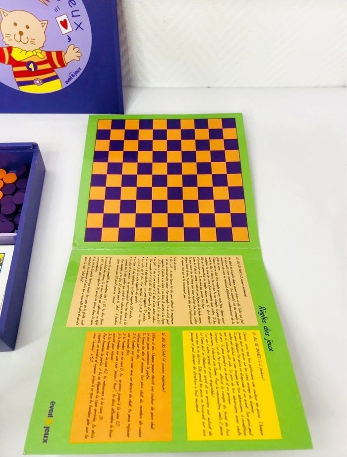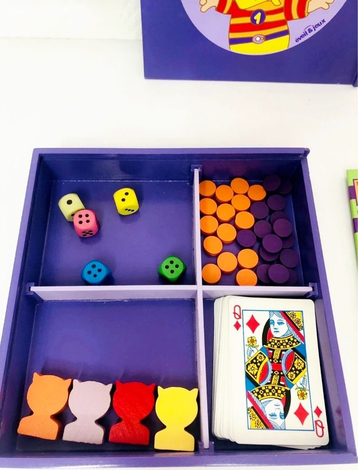Coffret de jeux en bois de la marque Éveil & Jeux. - Type de produit : Coffret de jeux - Marque : Jeux de société - Matière : Bois - Âge recommandé : 4 ans et + En très bon état Jeu de l’oie, jeu de dames, yam’s et cartes