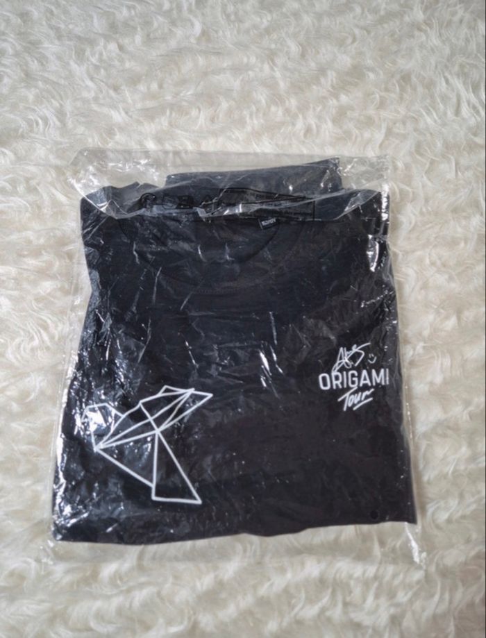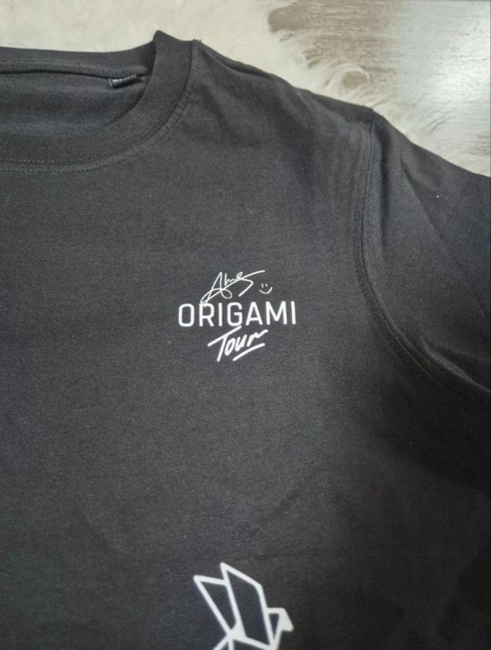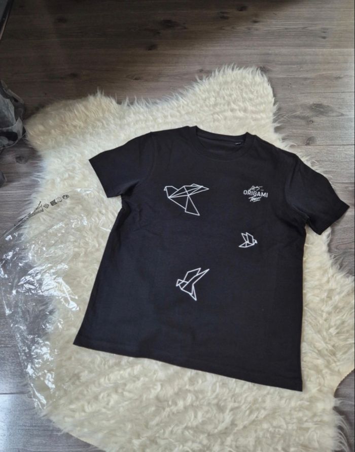 T-shirt publicitaire pour enfant "Origami Tour" de AHMED SYLLA Taille 152 / 12 ans 100 % coton coloris noir Imprimé à l'avant des symboles / logos du spectacle 2025 de l'humoriste et acteur français Article neuf, jamais porté, juste déballé pour les photos, cédé dans son emballage d'origine