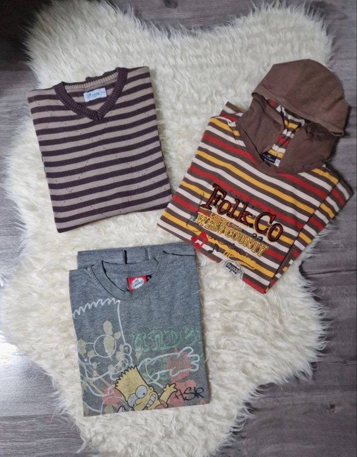Ensemble de 3 hauts pour garçon comprenant : - Tee-shirt à capuche, manches longues, marque SERGENT MAJOR, 100 % coton imprimé à rayures multicolores (en bon état, hormis la présence d'un petit trou sur le devant : voir photo) - 1 pull à manches longues, marque GEMO, col en V, 100 % coton fin et léger, coloris gris nuancés et discrètes touches de violine (en bon état, hormis la présence d'un petit trou au bas d'une manche niveau poignet : voir photo) - 1 Tee-shirt à manches courtes, marque THE SIMPSONS, tissu mélangé polyester et coton, coloris gris chiné, motif floqué légèrement délavé par les fréquents lavages Taille 14 ans Articles souvent portés, propres, mais pouvant encore avoir une seconde vie pour bricoler, jouer à l'extérieur...