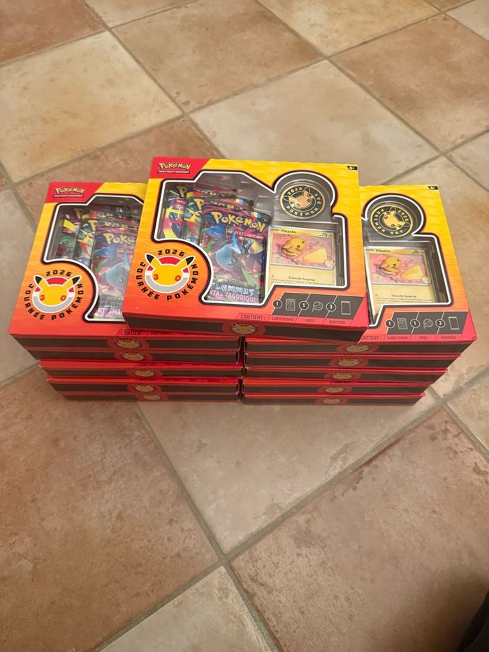 Vend 11 coffrets Collection 30ans reconditionné par moi même Dedans vous trouverez les 3 boosters d’origine reconditionné ainsi que la carte promo et le jeton Dans les boosters j’ai mis au total 9 EX, 2 Full Art, 4 AR ( vous êtes sûr d’avoir au moins un hits ou deux par coffrets ) Tout est refermé comme à l’origine Idéal pour offrir à des enfants qui voudrait ouvrir du Pokémon et avoir des belles cartes pour par très cher ou alors pour compléter les collections Je fais 10€ le coffret