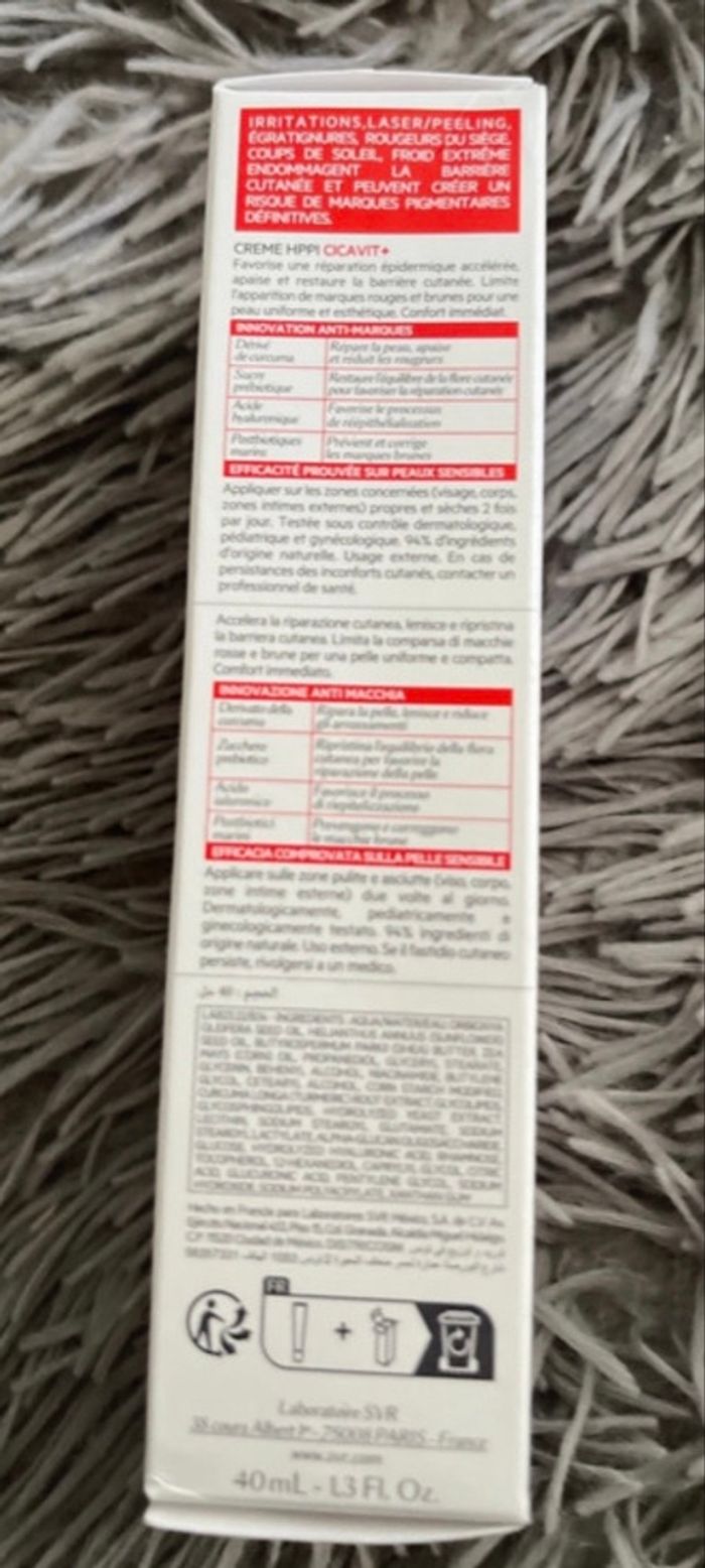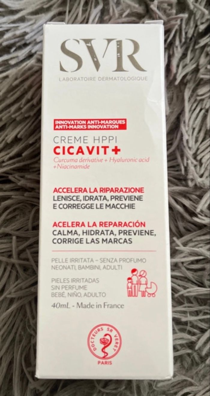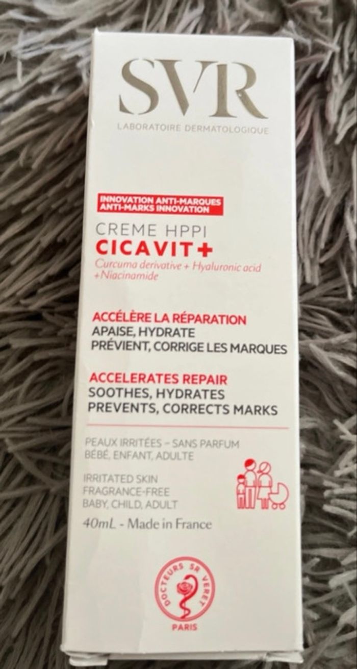 SVR crème CICAVIT+ | Peaux abimées 40ml Adoptez le réflexe Cicavit+ Crème. Ce soin accélère de 7 fois la réparation cutanée, apaise intensément et prévient des marques liées au processus de réparation. Pour les peaux abîmées et irritées de toute la famille : sécheresses, rougeurs, gerçures, écorchures, rougeurs du siège, marques de varicelle, tatouages, post-actes dermatologiques (peeling, laser), échauffements, coups de soleil, épilation, rasage.