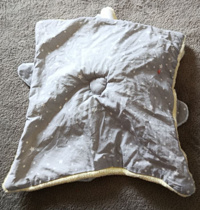 Doudou et compagnie Doudou carré plat en velours de couleur jaune et de l autre côté en tissu de couleur gris avec étoiles blanche Étoile en velours de couleur bleu sur le doudou avec lapin en velours de couleur blanc aux oreilles en velours de couleur jaune Yeux de couleur noir et nez de couleur rose
